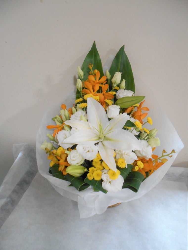 お悔やみ お供えの花 供花 (白ユリをメインに黄色の洋蘭をあしらったバスケットアレンジ)