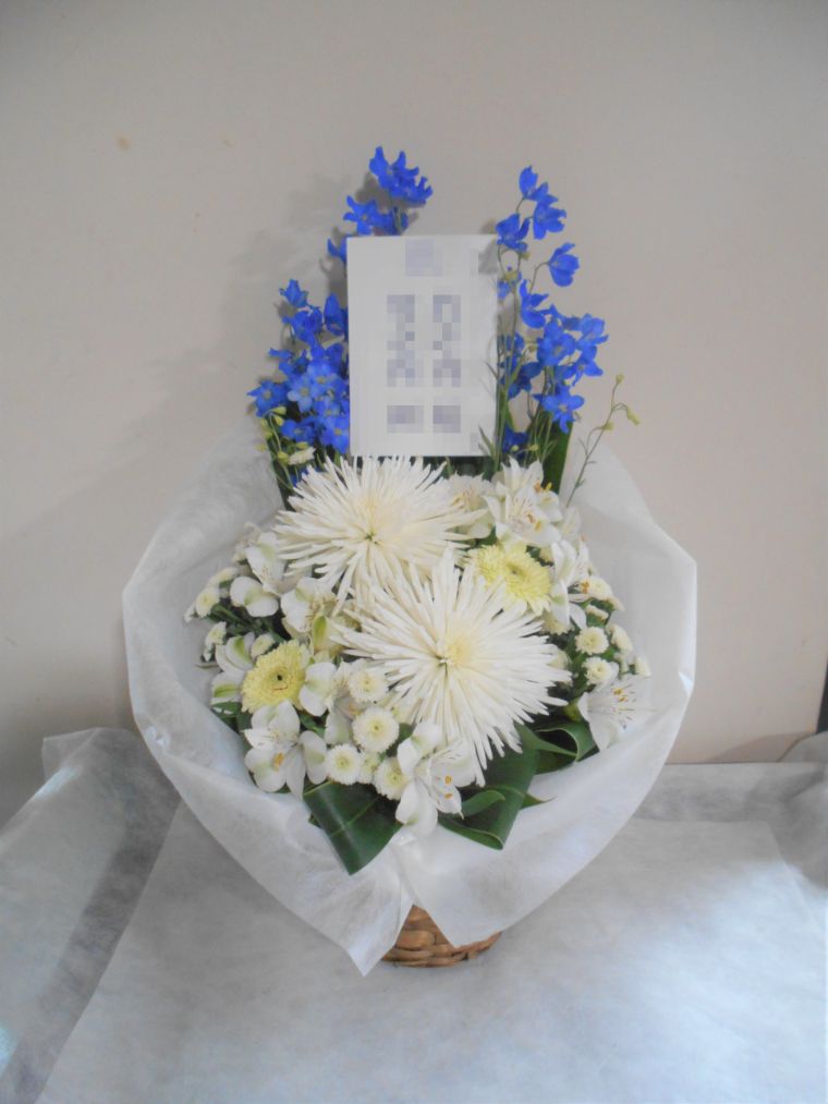 お悔やみ お供えの花 供花 (白基調に青系挿し色をそえたバスケットアレンジ)