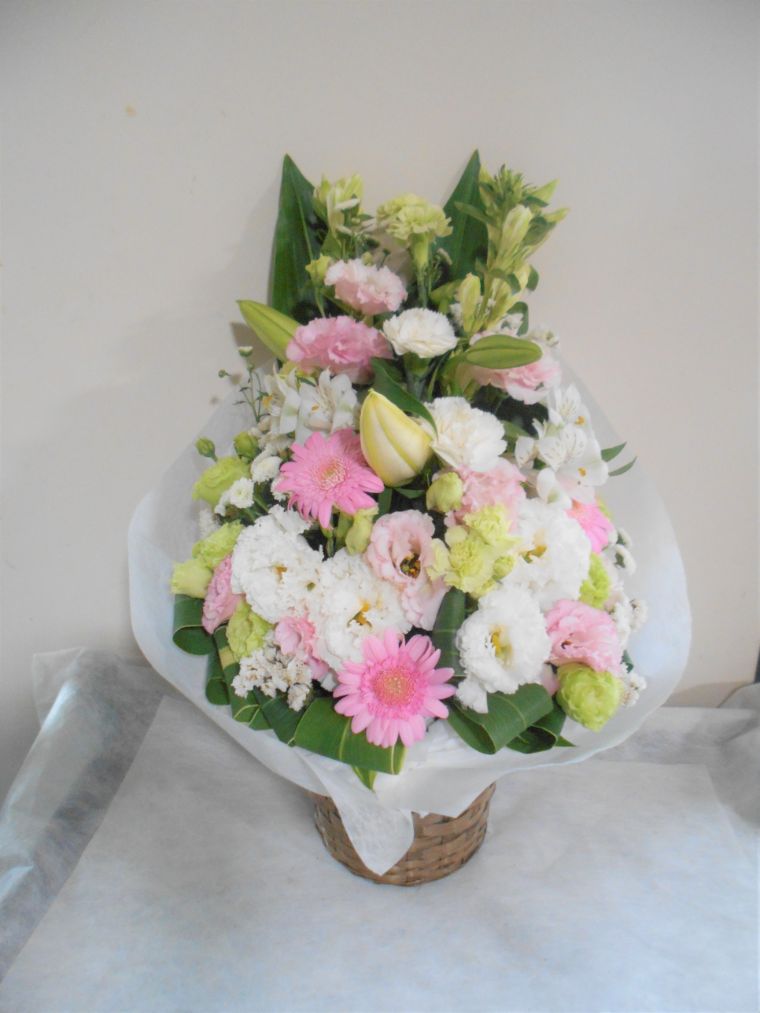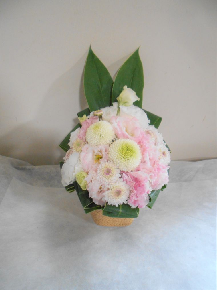 お悔やみ お供えの花 供花 (淡いピンク系のお花でまとめたバスケットアレンジ)