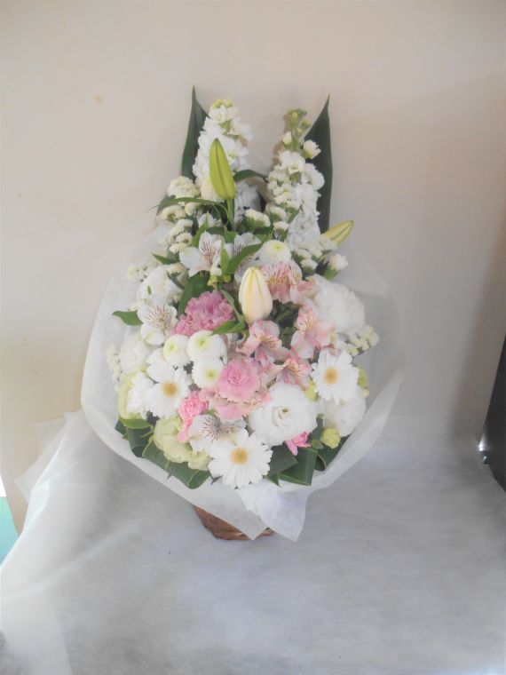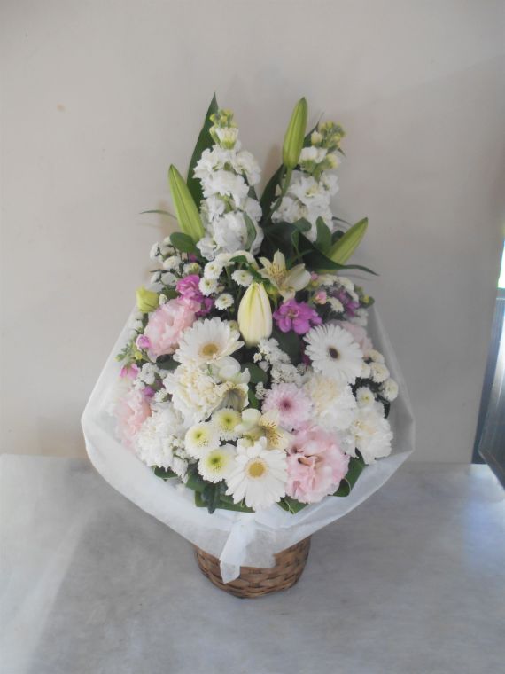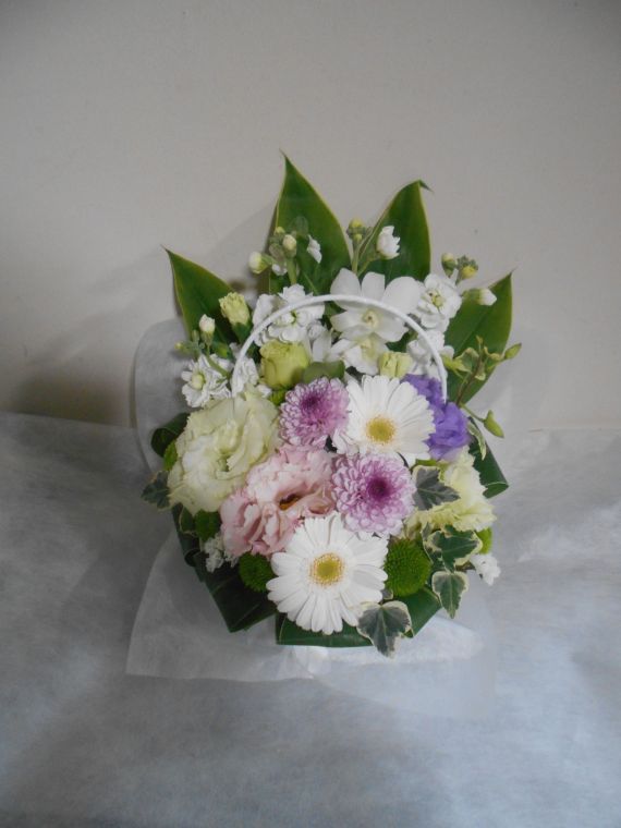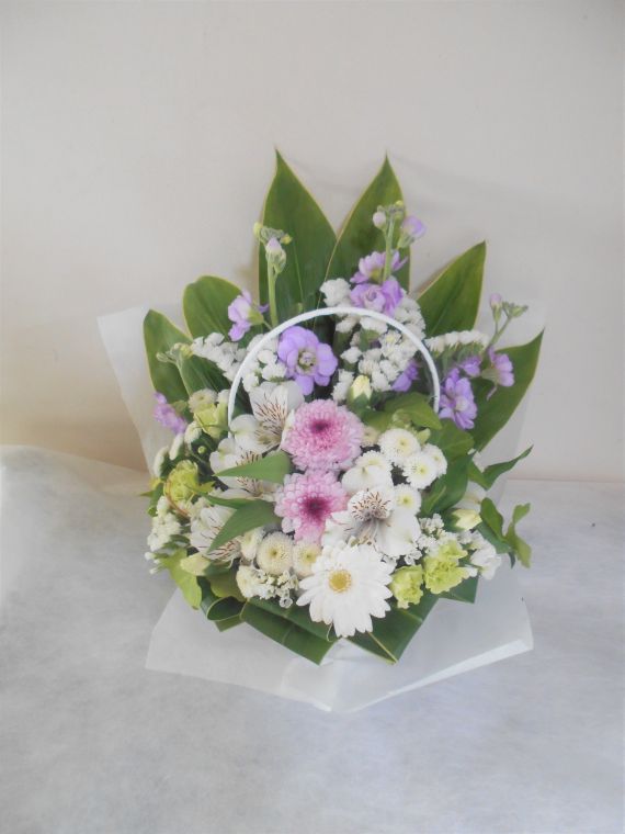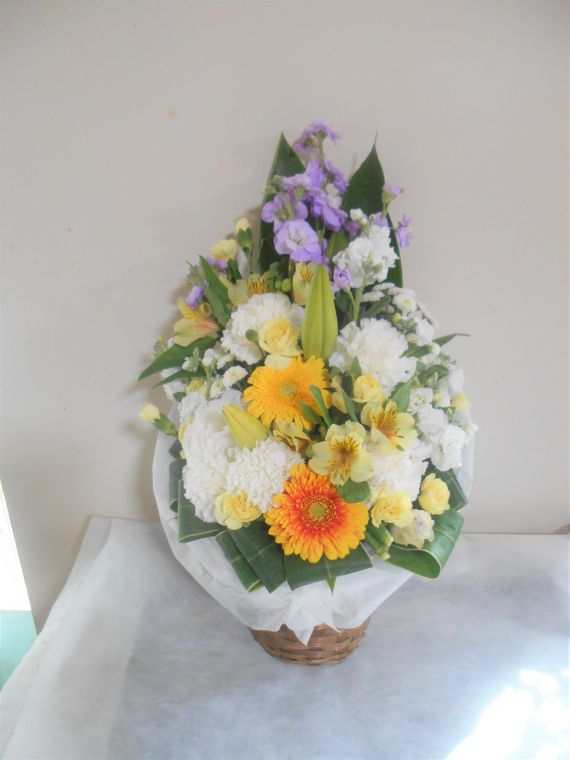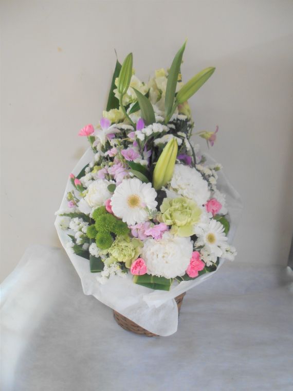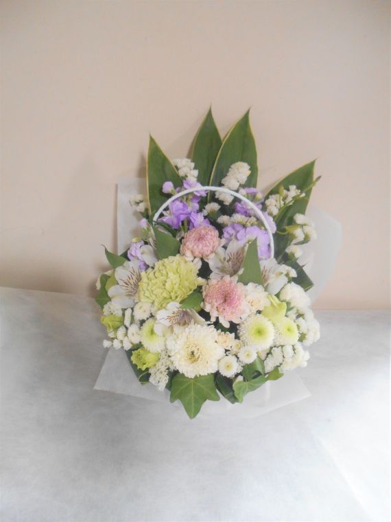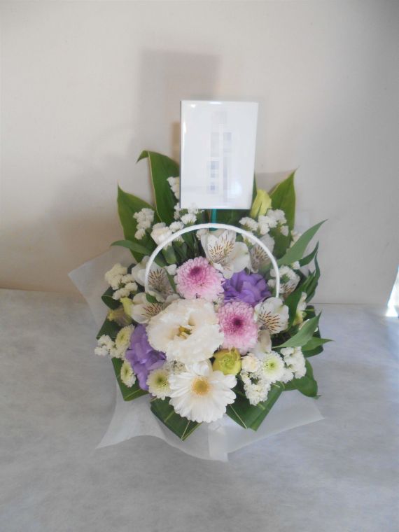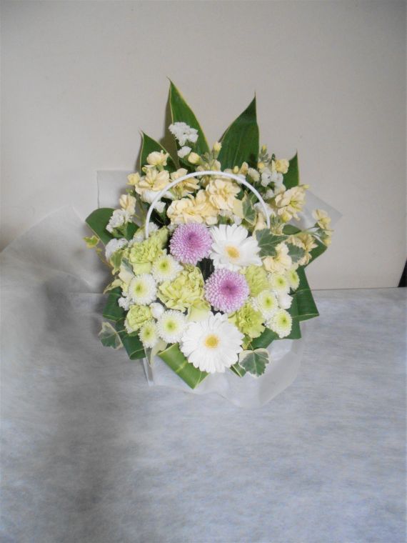 お悔やみ お供えの花 供花 (ホワイト&淡色カラーの手付きバスケットアレンジ)
