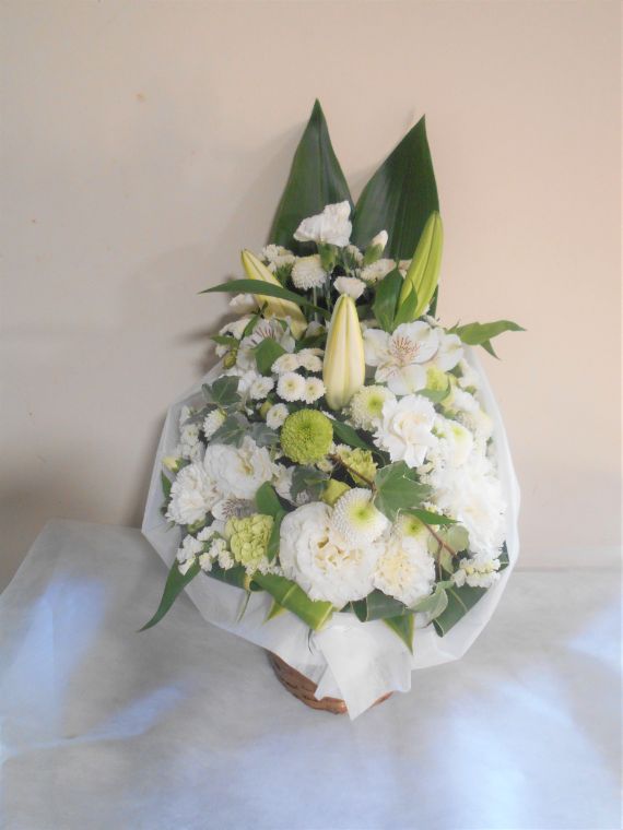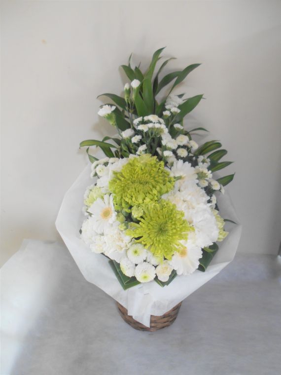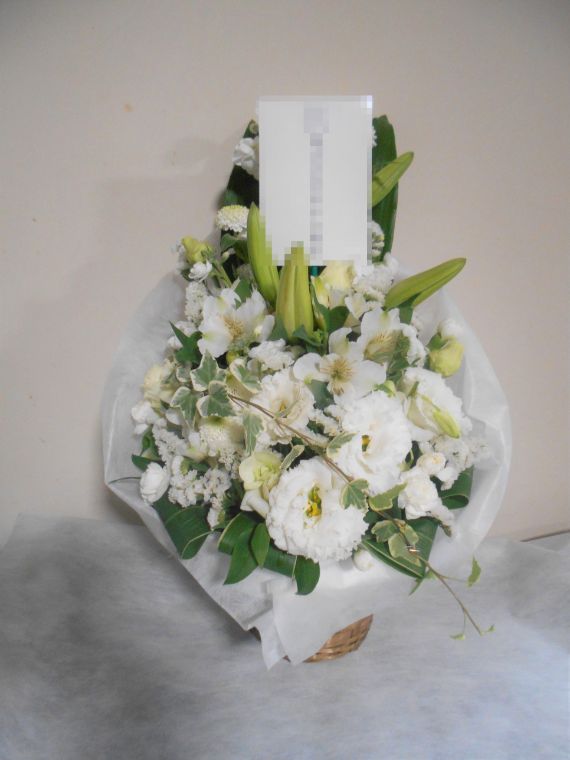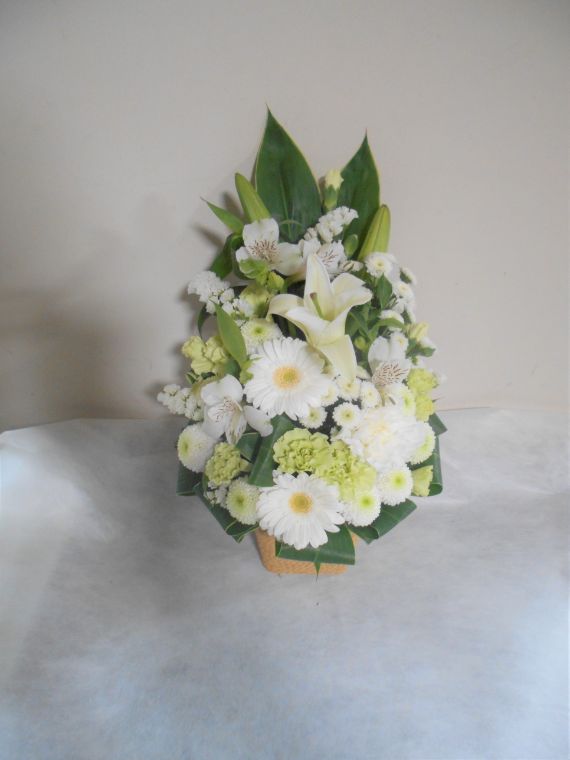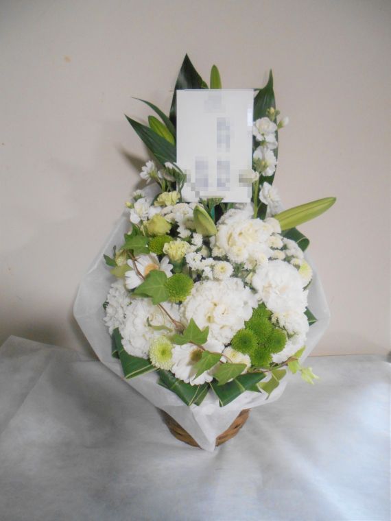 お悔やみ お供えの花 供花 (ホワイト&グリーンを基調にしたバスケットアレンジ)
