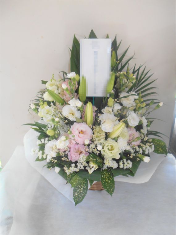 お悔やみ お供えの花 供花 (ホワイト&ピンクでまとめたバスケットアレンジ)