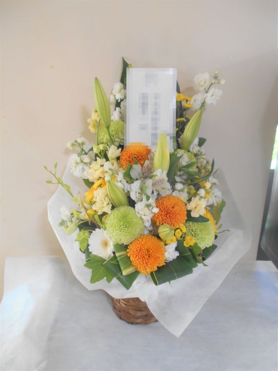 お悔やみ お供えの花 供花 (黄ユリをメインにホワイト系でまとめたバスケットアレンジ)