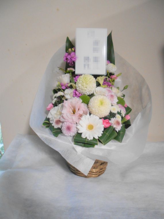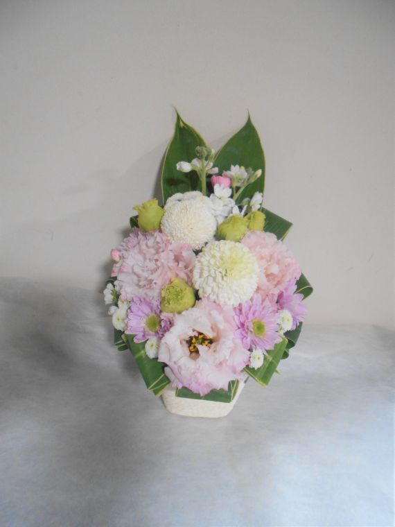 お悔やみ お供えの花 供花 (淡いピンク系のお花でまとめたバスケットアレンジ)