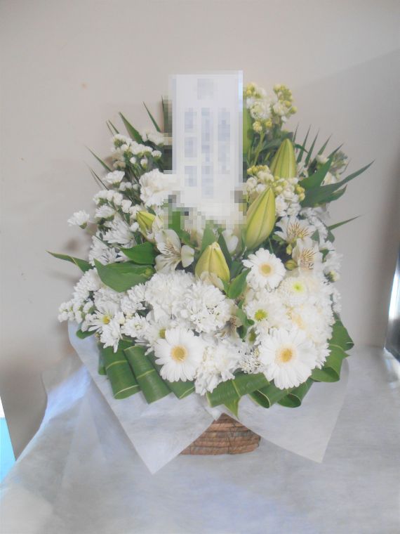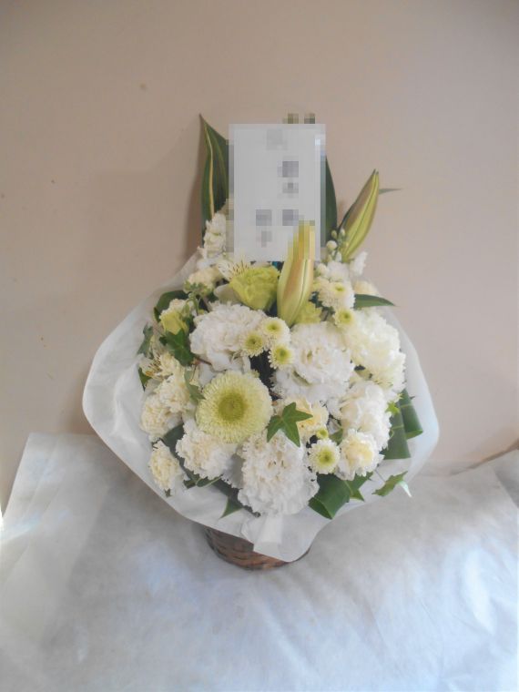 お悔やみ お供えの花 供花 (白基調でユリのお花をメインにしたバスケットアレンジ)