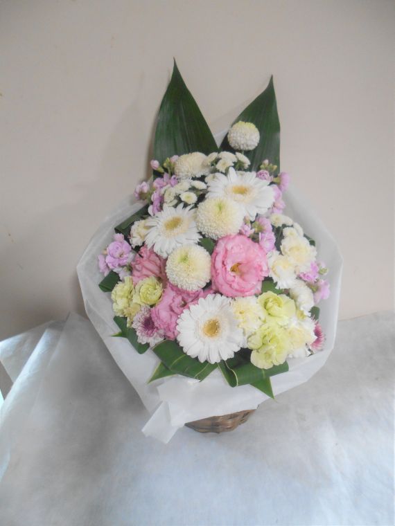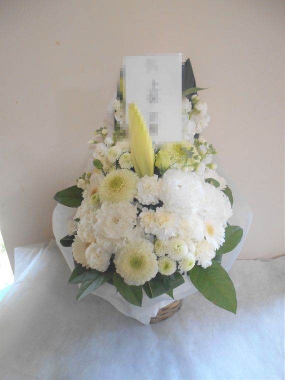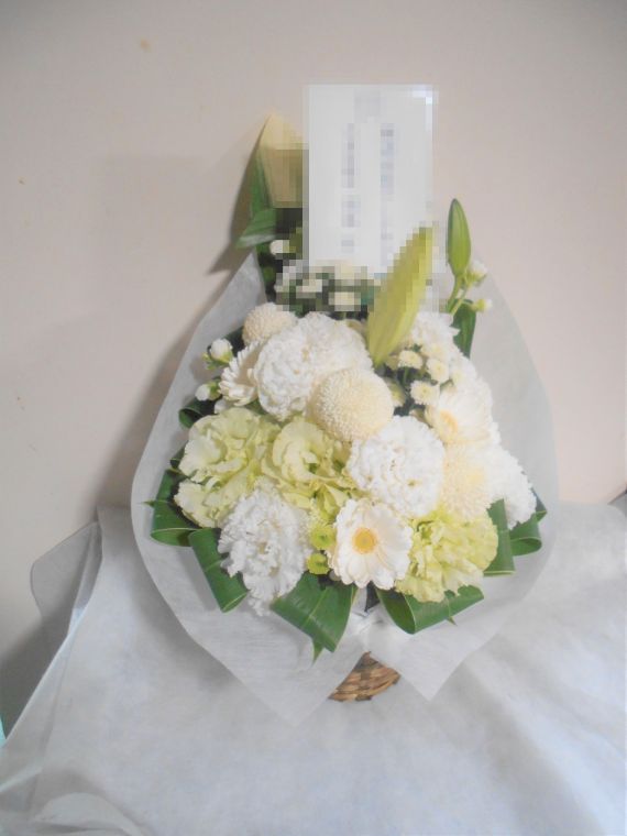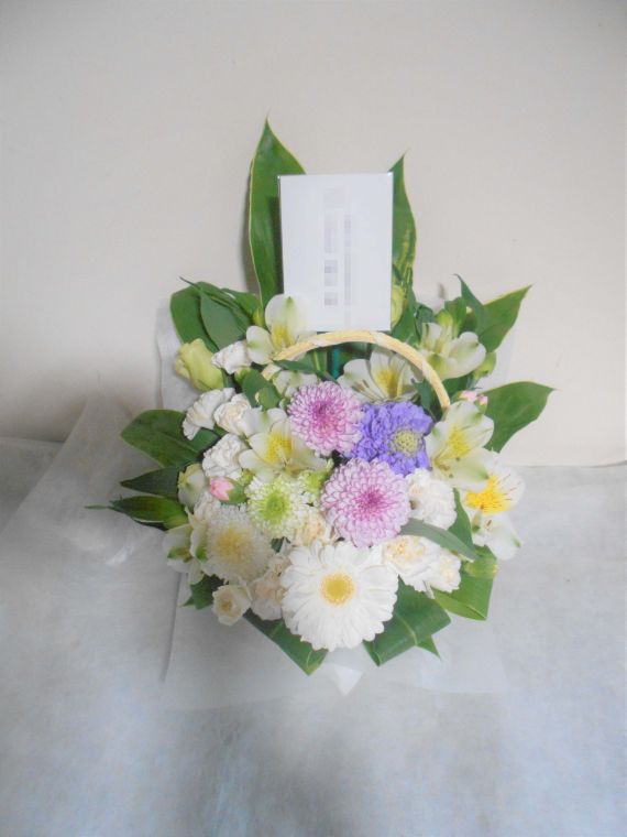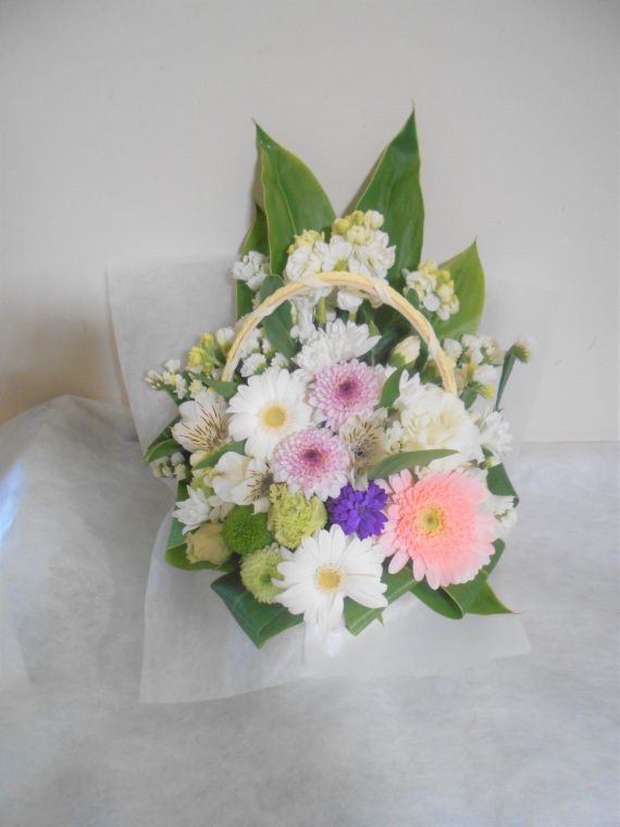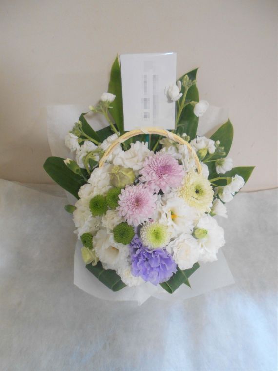 お悔やみ お供えの花 供花 (ホワイト&淡色カラーの手付きバスケットアレンジ)