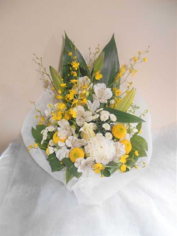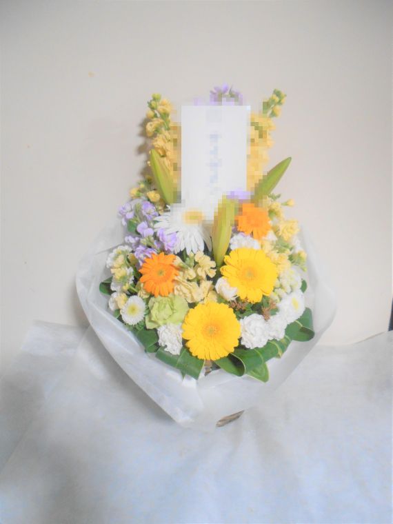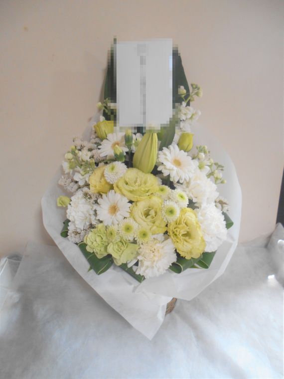 【白系】お悔やみ お供えの花 供花 (黄ユリをメインにホワイト系のお花でまとめたバスケットアレンジ)