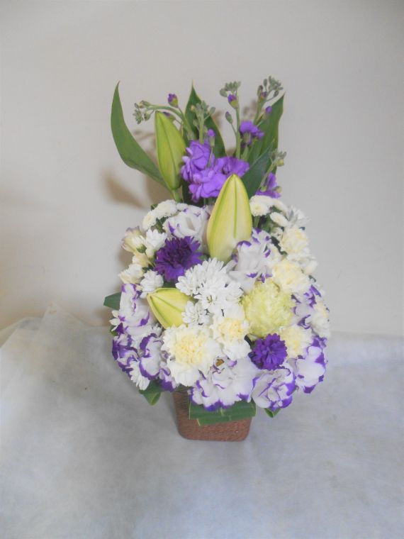 お悔やみ お供えの花 供花 (白基調でユリと紫系のお花をあしらったバスケットアレンジ)