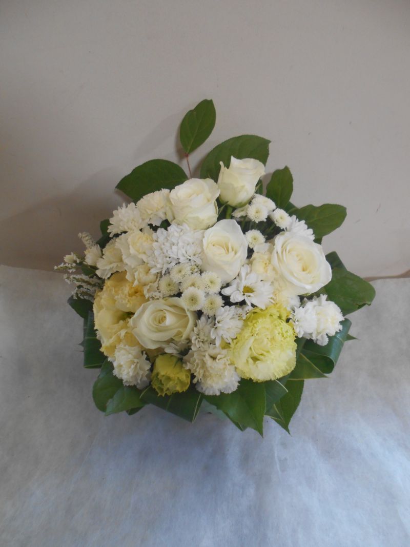 お悔やみ お供えの花 供花 (白バラと季節のお花のバスケットアレンジ)