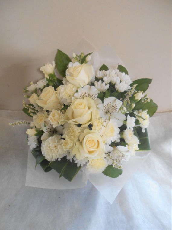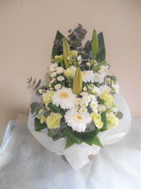【白系】お悔やみ お供えの花 供花 (ホワイト&淡色カラーの手付きバスケットアレンジ)