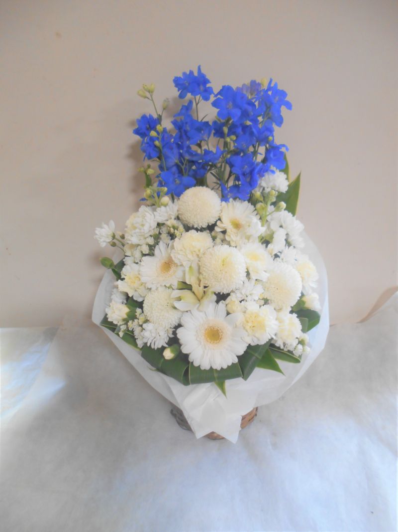 お悔やみ お供えの花 供花 (白基調に青系挿し色をそえたバスケットアレンジ)