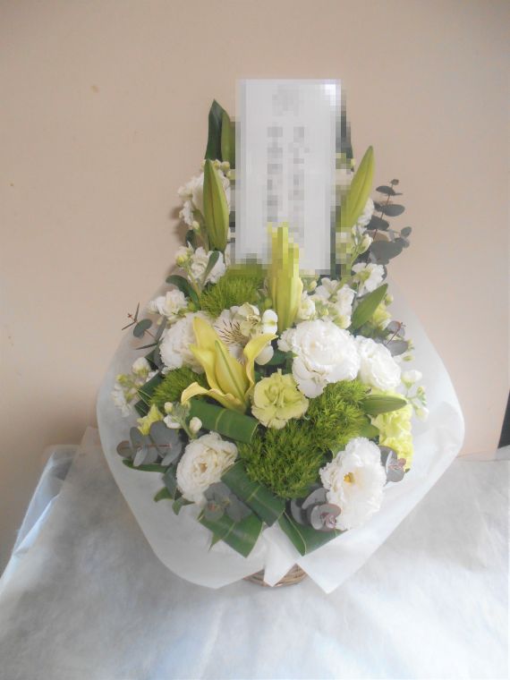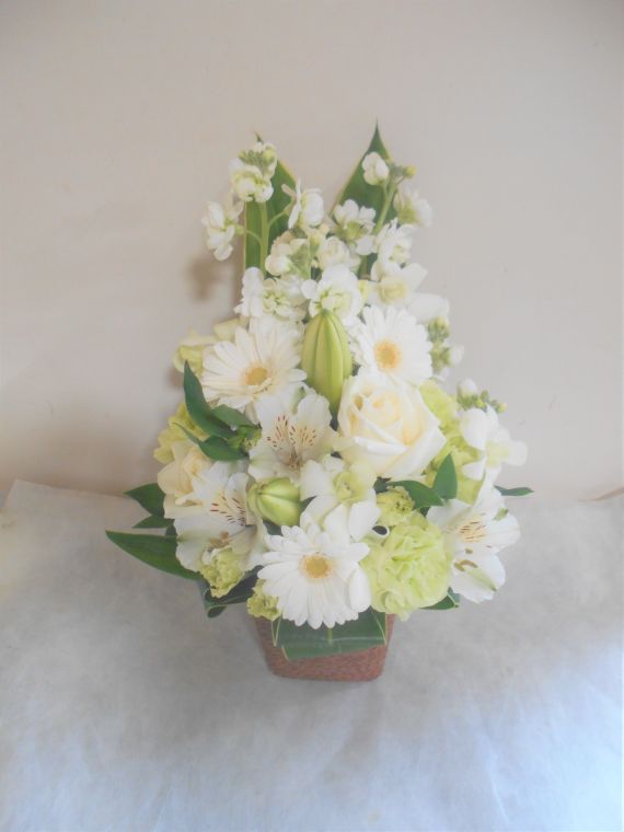 お悔やみ お供えの花 供花 (白ユリをメインにホワイト&グリーンでまとめたバスケットアレンジ)