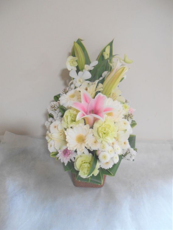 お悔やみ お供えの花 供花 (白ユリをメインにホワイト&ピンクでまとめたバスケットアレンジ)