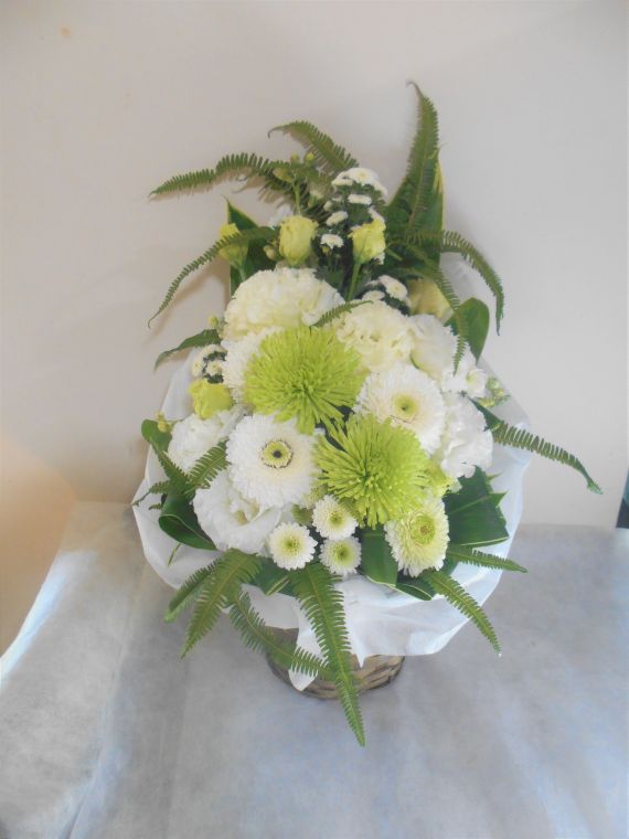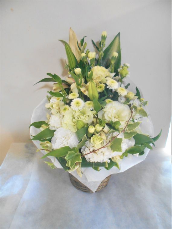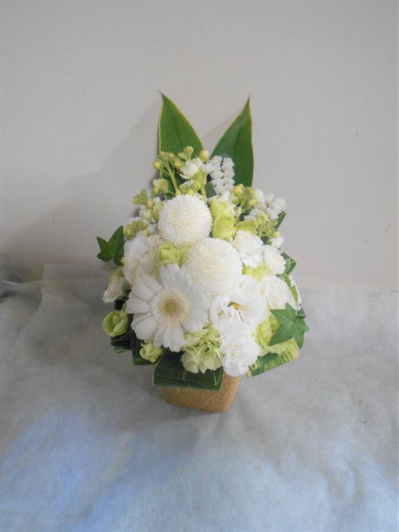 お悔やみ お供えの花 供花 (ホワイト&グリーンでまとめたバスケットアレンジ)