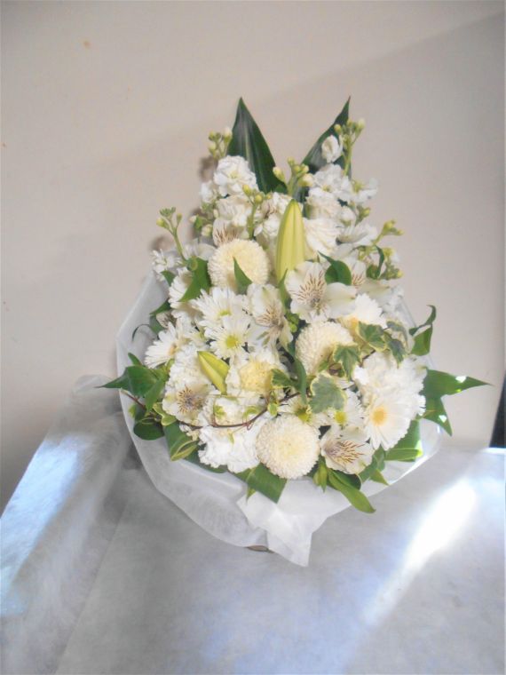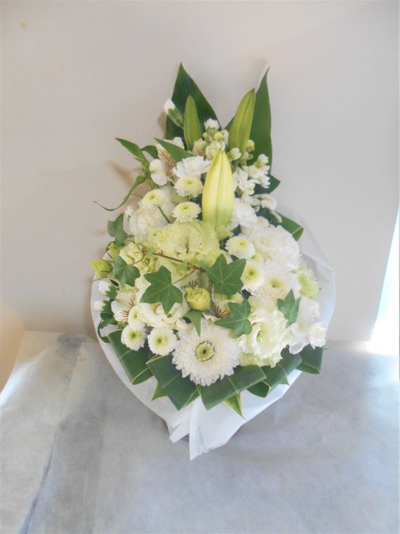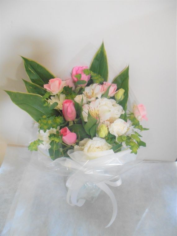 【白系】お悔やみ お供えの花 供花 (ピンクのバラと白いお花でまとめた優しい花束)