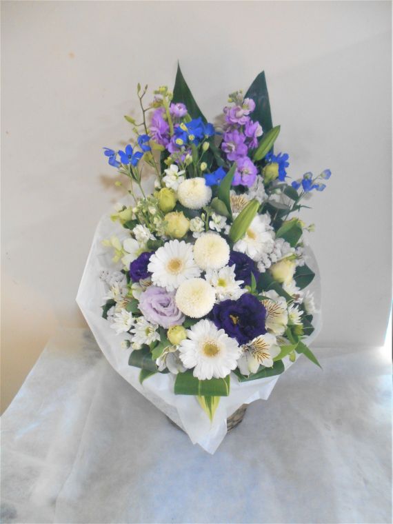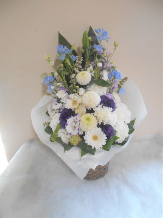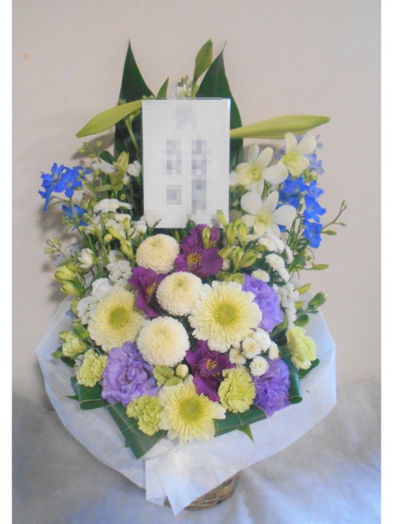お悔やみ お供えの花 供花 (ホワイト&青・紫系カラーのお花でまとめたバスケットアレンジ)
