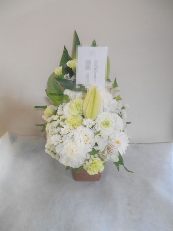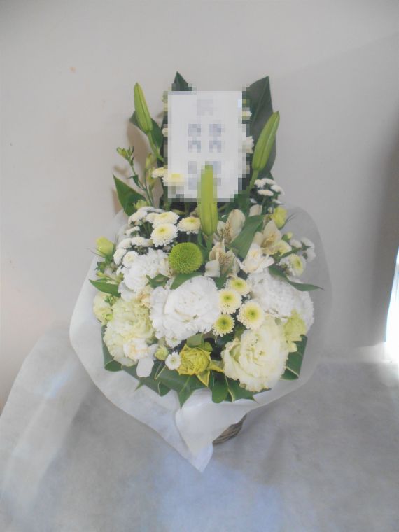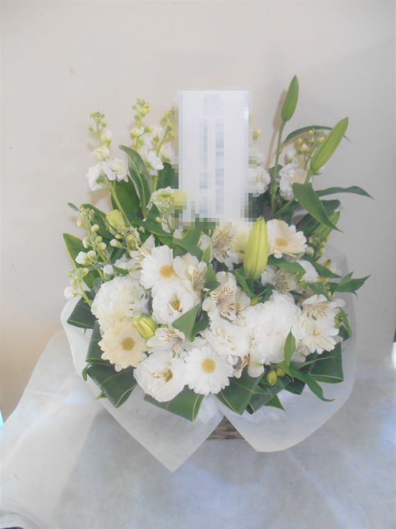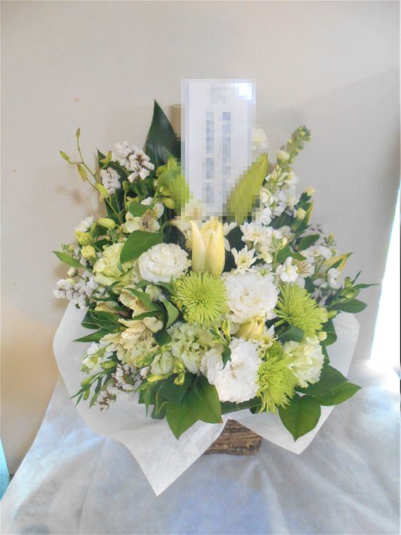 お悔やみ お供えの花 供花 (ホワイト&グリーンを基調にしたバスケットアレンジ)