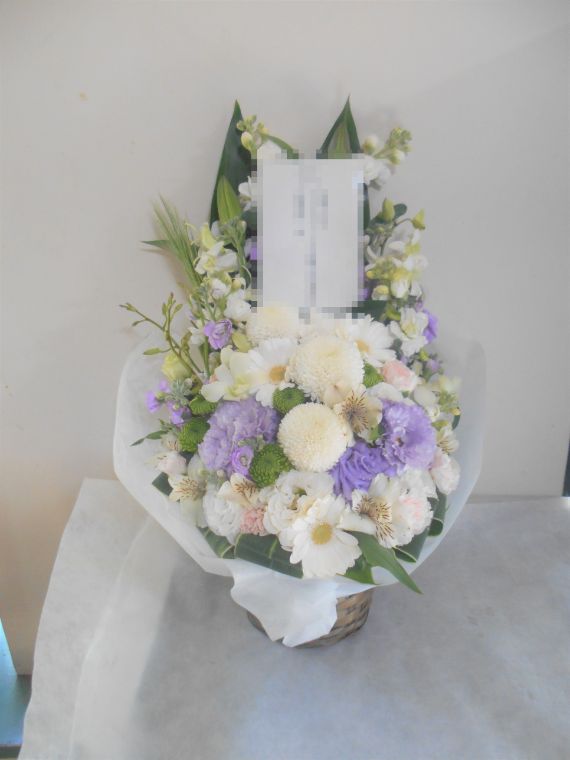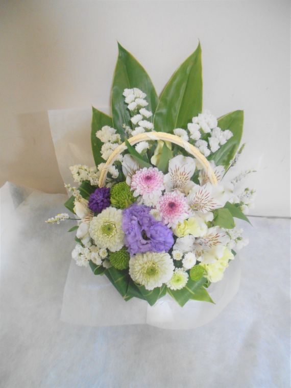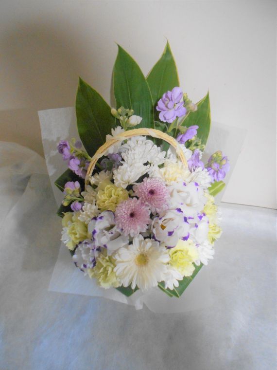 お悔やみ お供えの花 供花 (ホワイト&淡色カラーの手付きバスケットアレンジ)