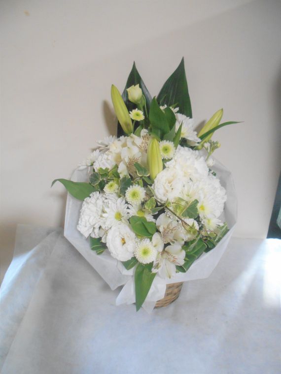 【白系】お悔やみ お供えの花 供花 (ホワイト&淡色カラーの手付きバスケットアレンジ)