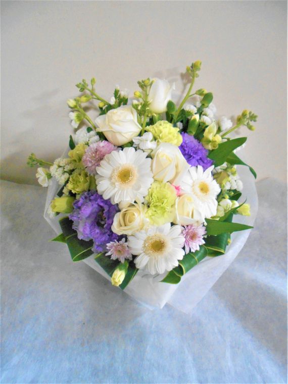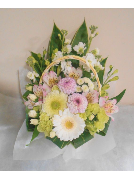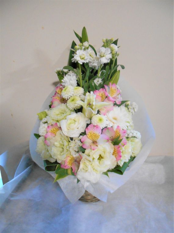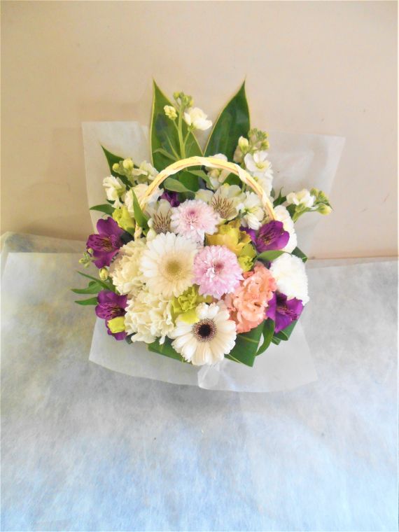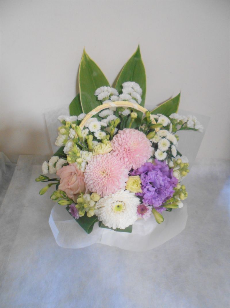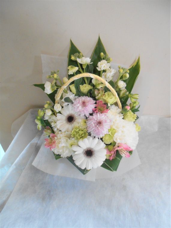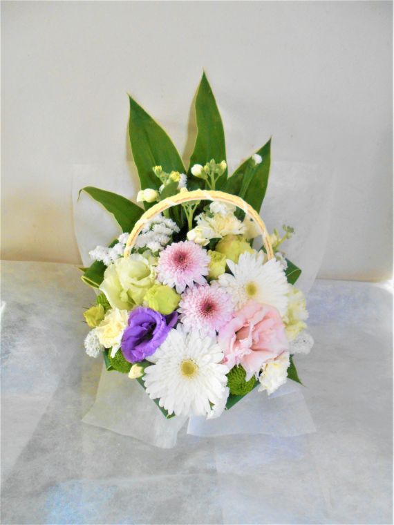 お悔やみ お供えの花 供花 (ホワイト&淡色カラーの手付きバスケットアレンジ)