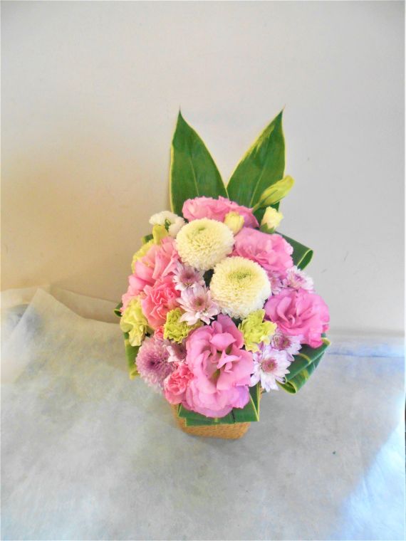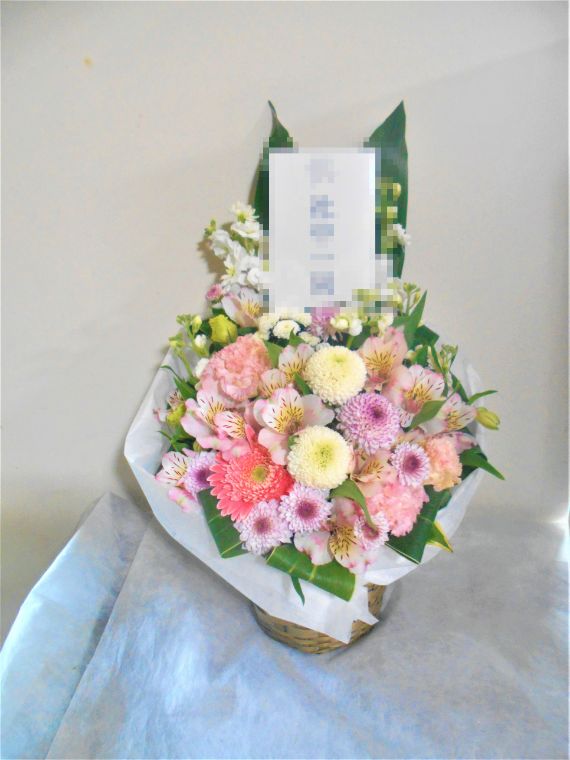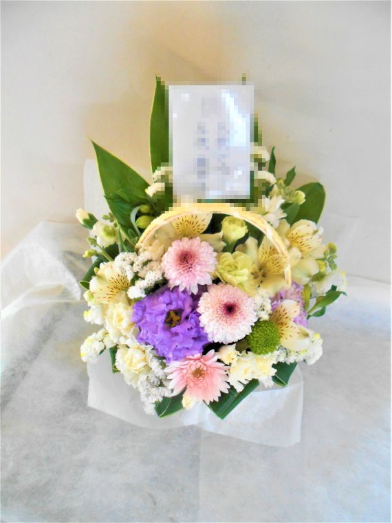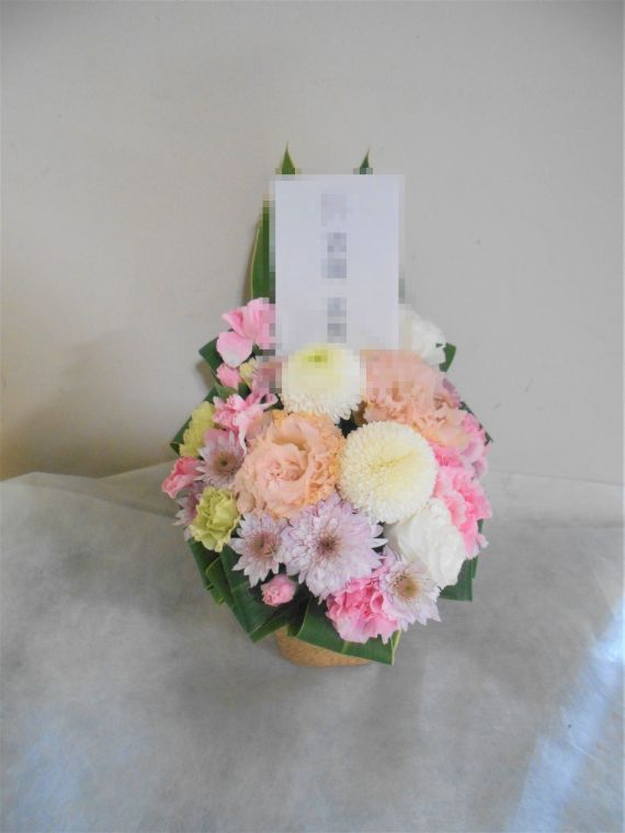 お悔やみ お供えの花 供花 (淡いピンク系のお花でまとめたバスケットアレンジ)