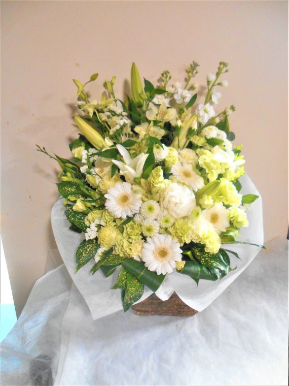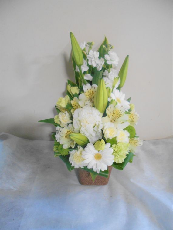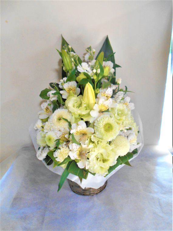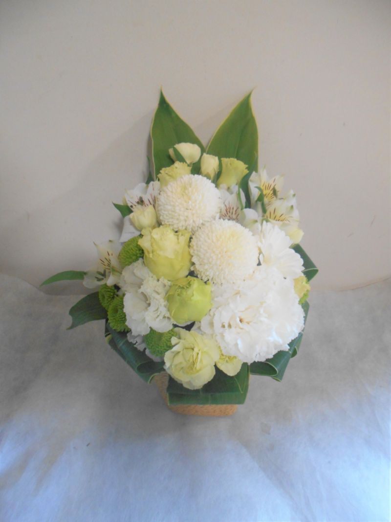 お悔やみ お供えの花 供花 (ホワイト&グリーンでまとめたバスケットアレンジ)