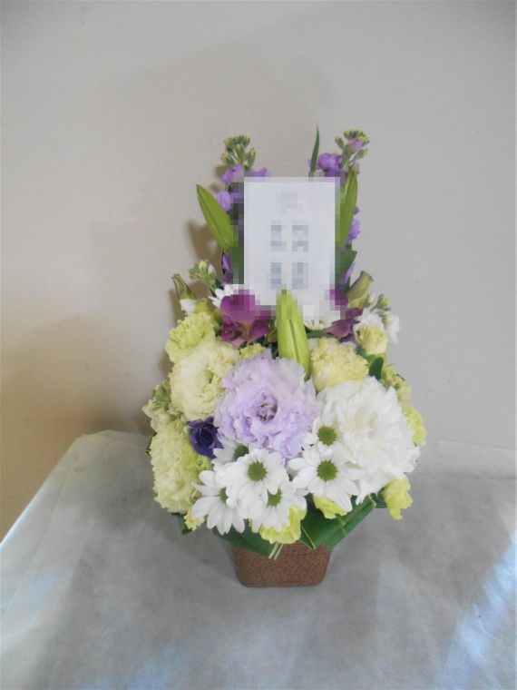 お悔やみ お供えの花 供花 (白基調でユリと紫系のお花をあしらったバスケットアレンジ)