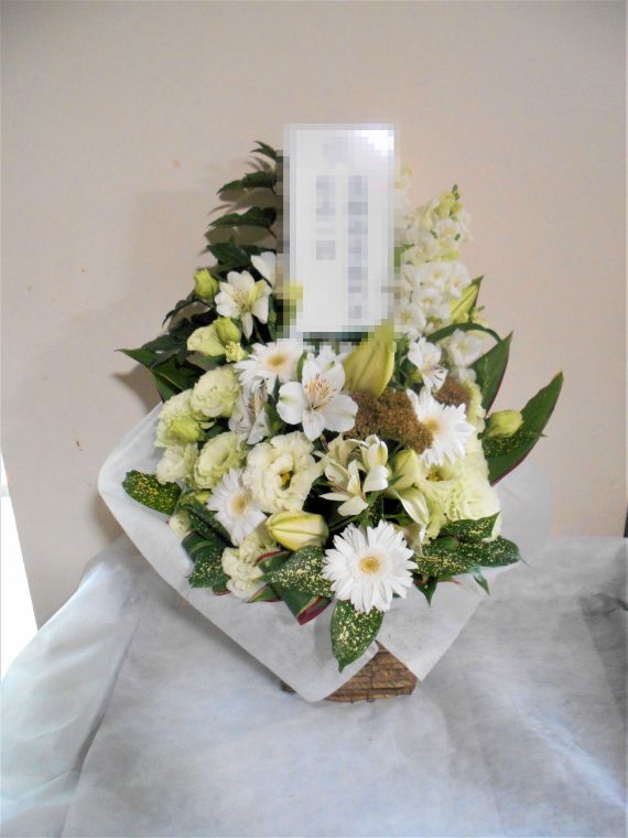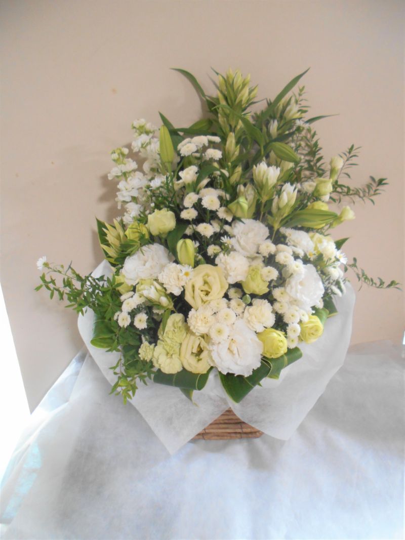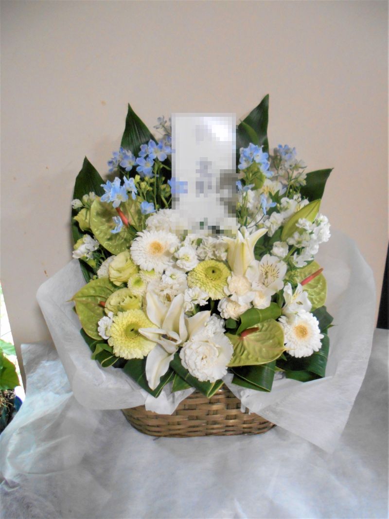 お悔やみ お供えの花 供花 (ホワイト&グリーンを基調にしたバスケットアレンジ)