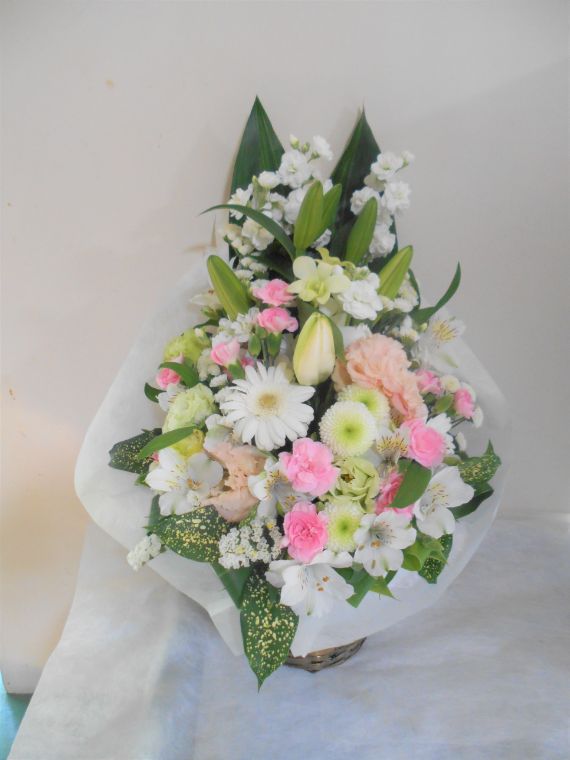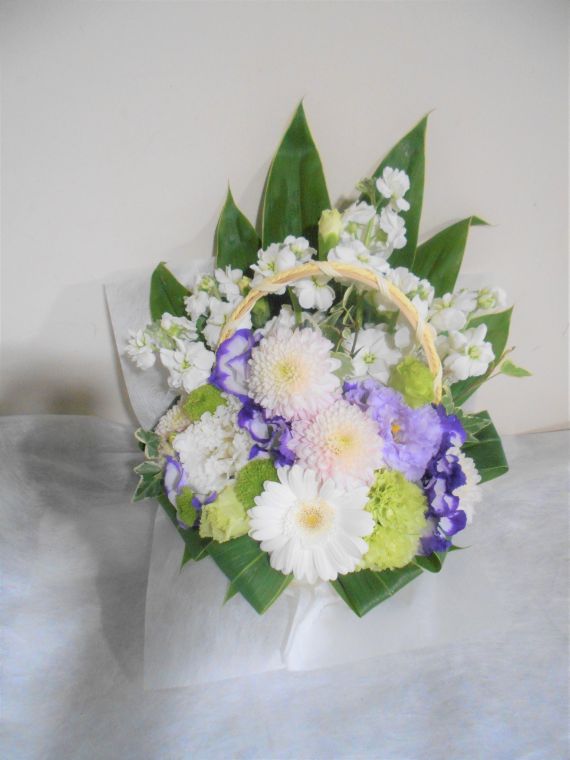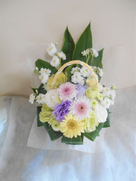 お悔やみ お供えの花 供花 (ホワイト&淡色カラーの手付きバスケットアレンジ)