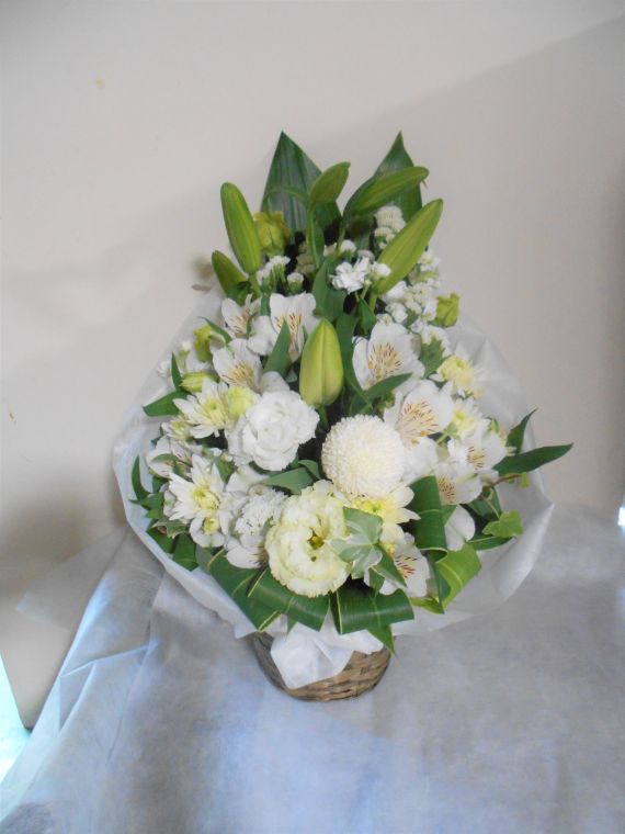 お悔やみ お供えの花 供花 (白ユリをメインにホワイト系でまとめたバスケットアレンジ)