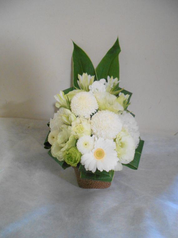 お悔やみ お供えの花 供花 (ホワイト&グリーンでまとめたバスケットアレンジ)