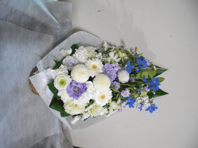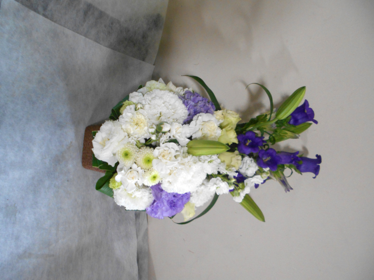 お悔やみ お供えの花 供花 (ホワイト&青・紫系カラーのお花でまとめたバスケットアレンジ)