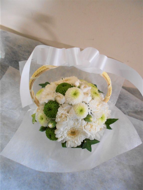 お悔やみ お供えの花 供花 (ホワイト&グリーンを基調にした手付きバスケットアレンジ)