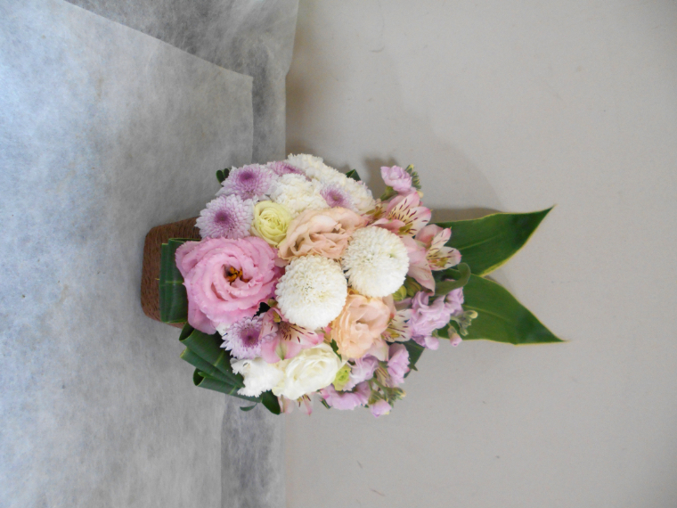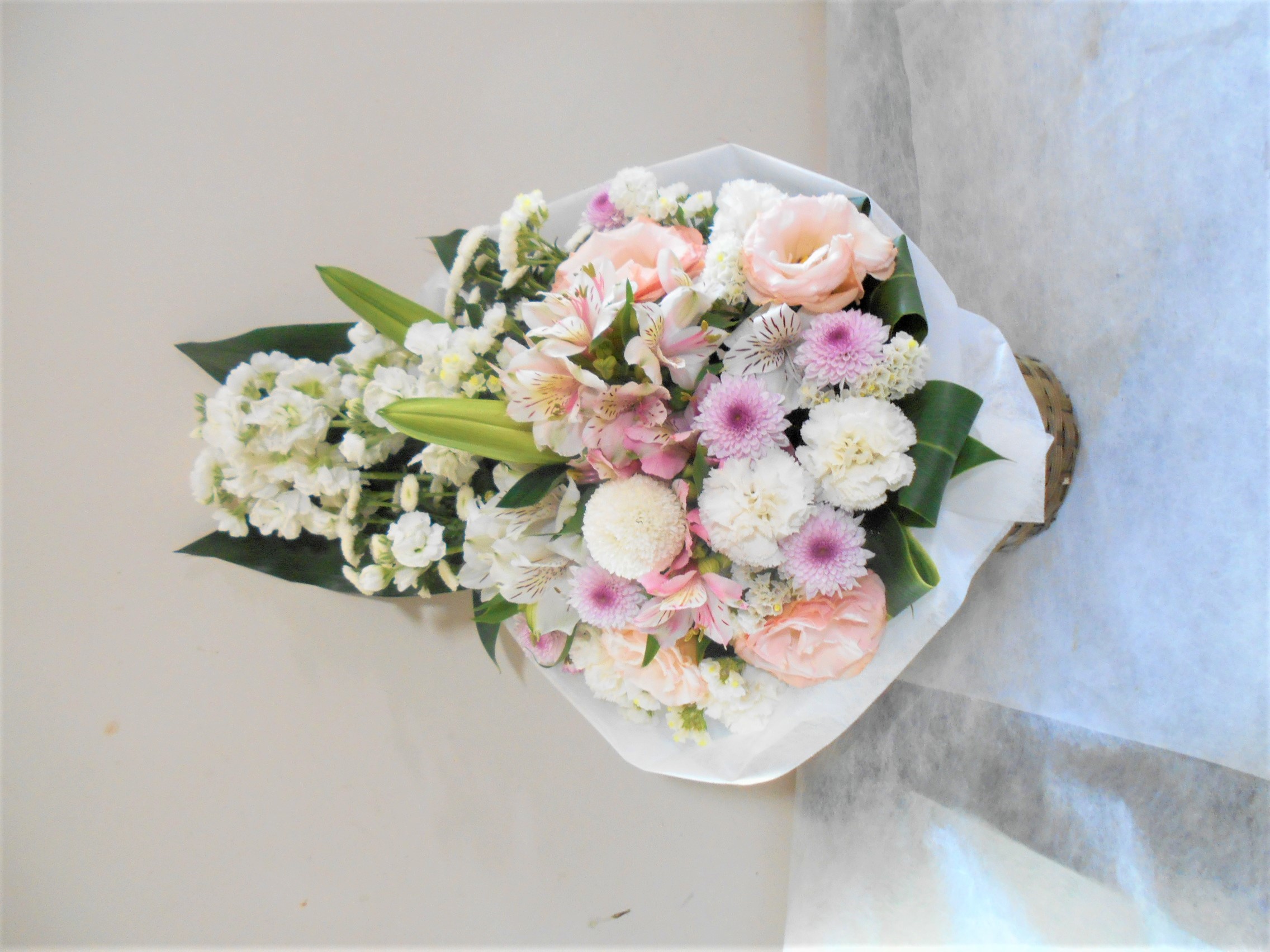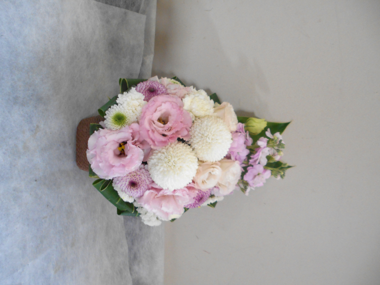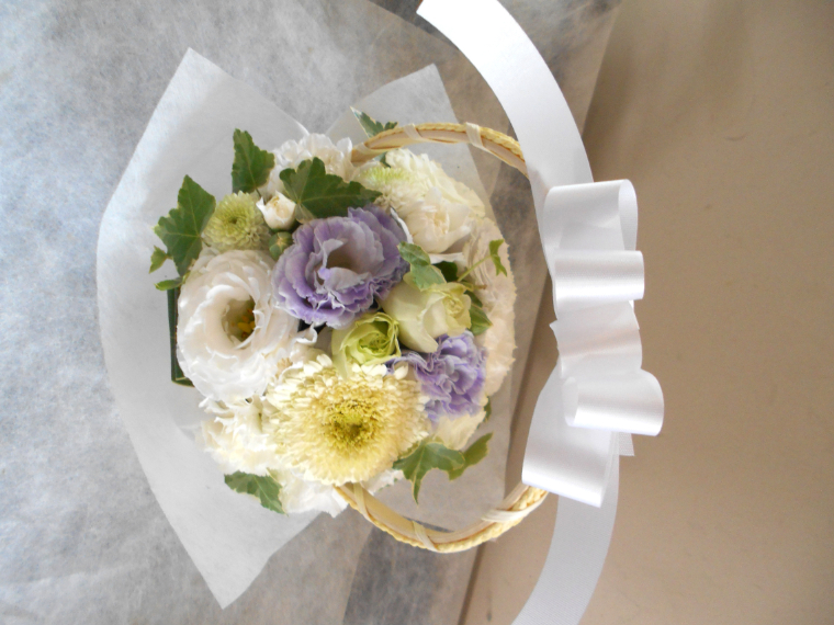 お悔やみ お供えの花 供花 (ホワイト&淡色カラーの手付きバスケットアレンジ)