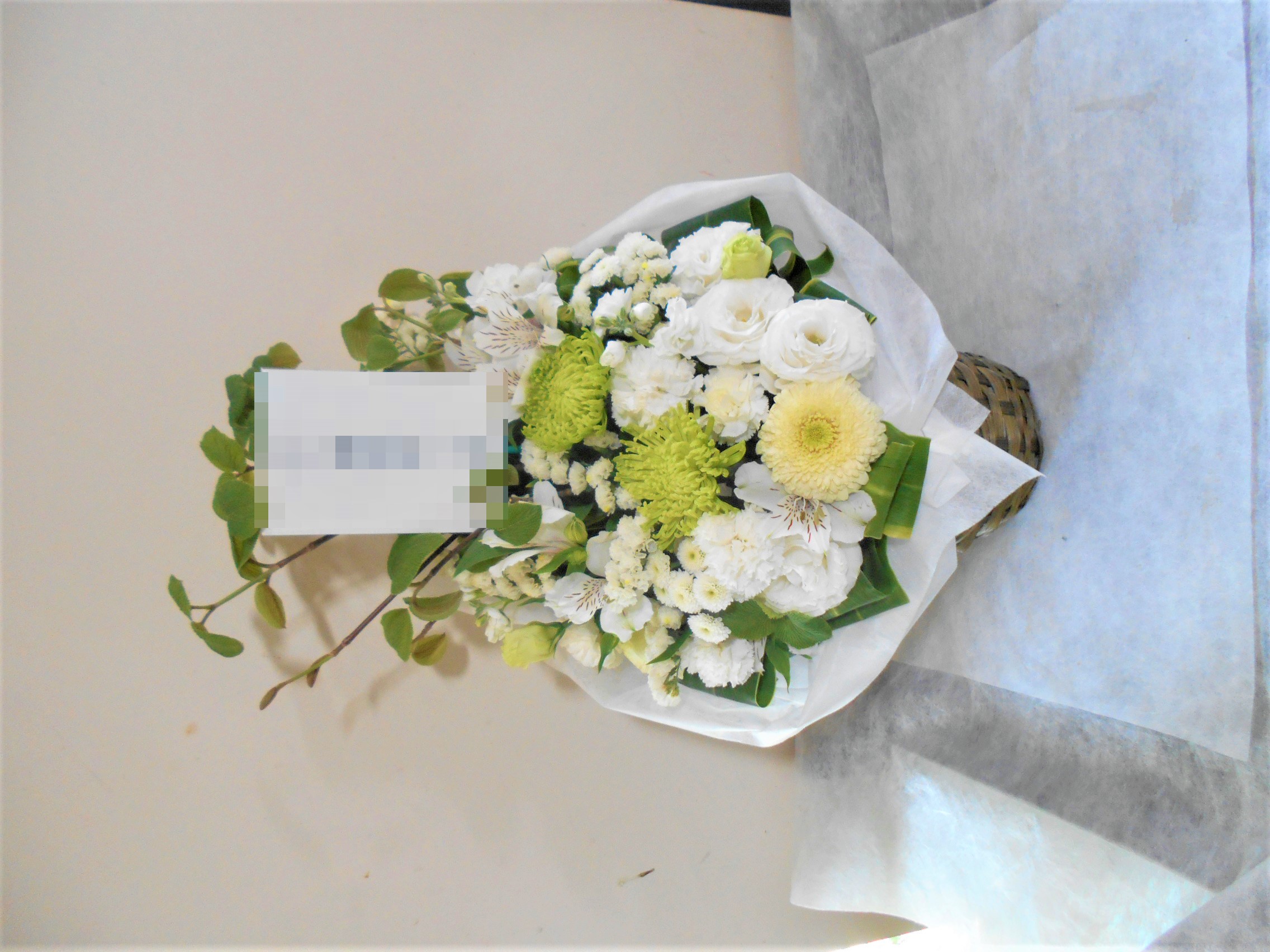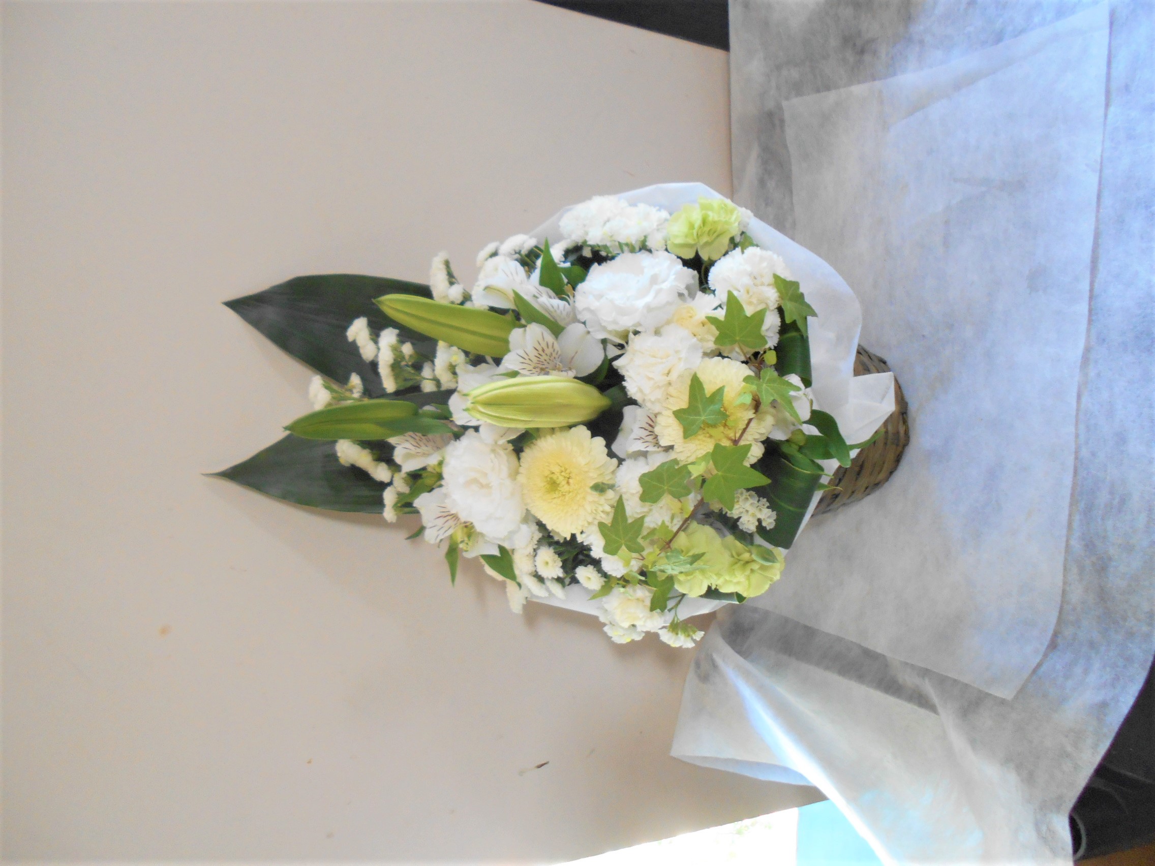 お悔やみ お供えの花 供花 (ホワイト&グリーンを基調にしたバスケットアレンジ)