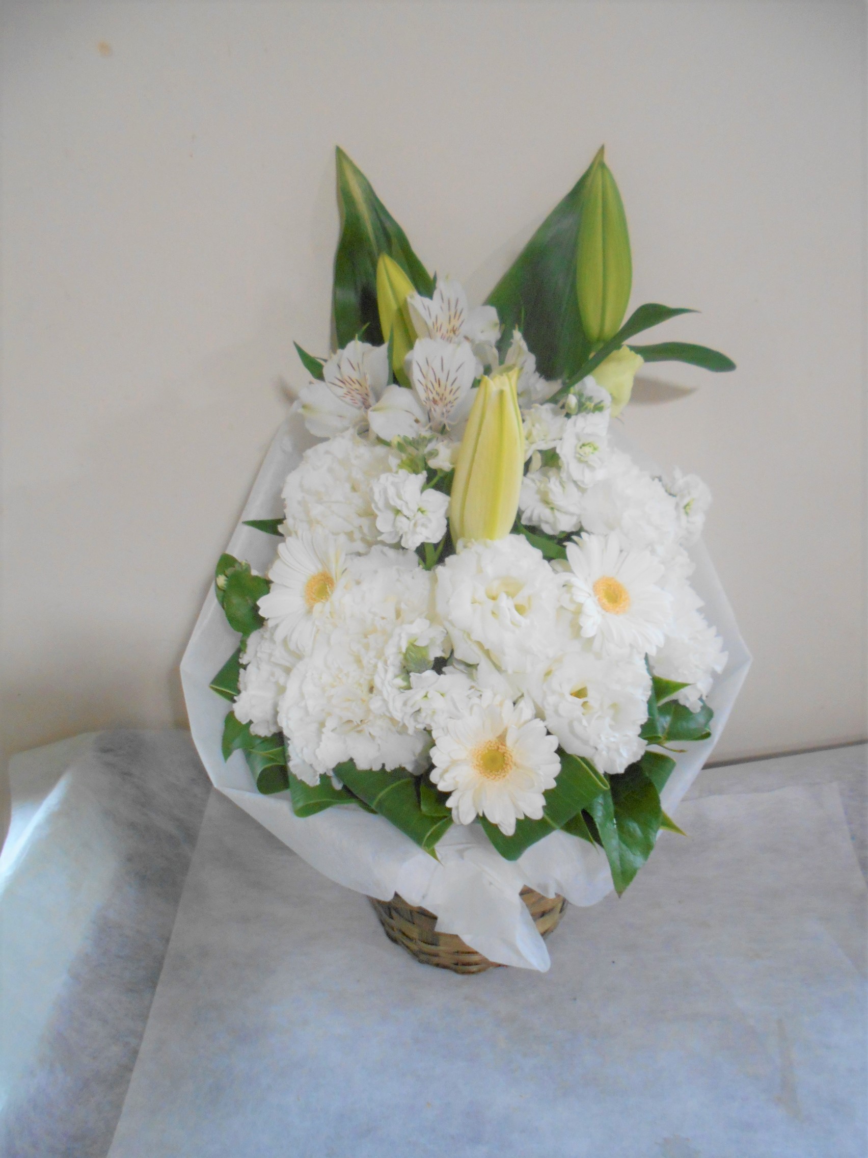 お悔やみ お供えの花 供花 (白ユリをメインにホワイト系でまとめたバスケットアレンジ)