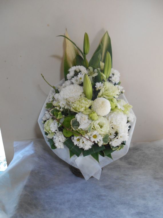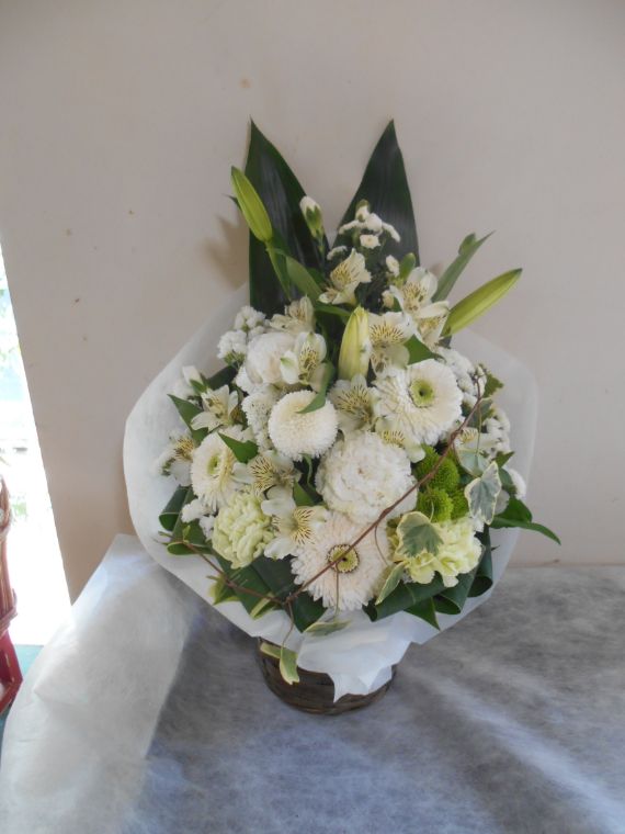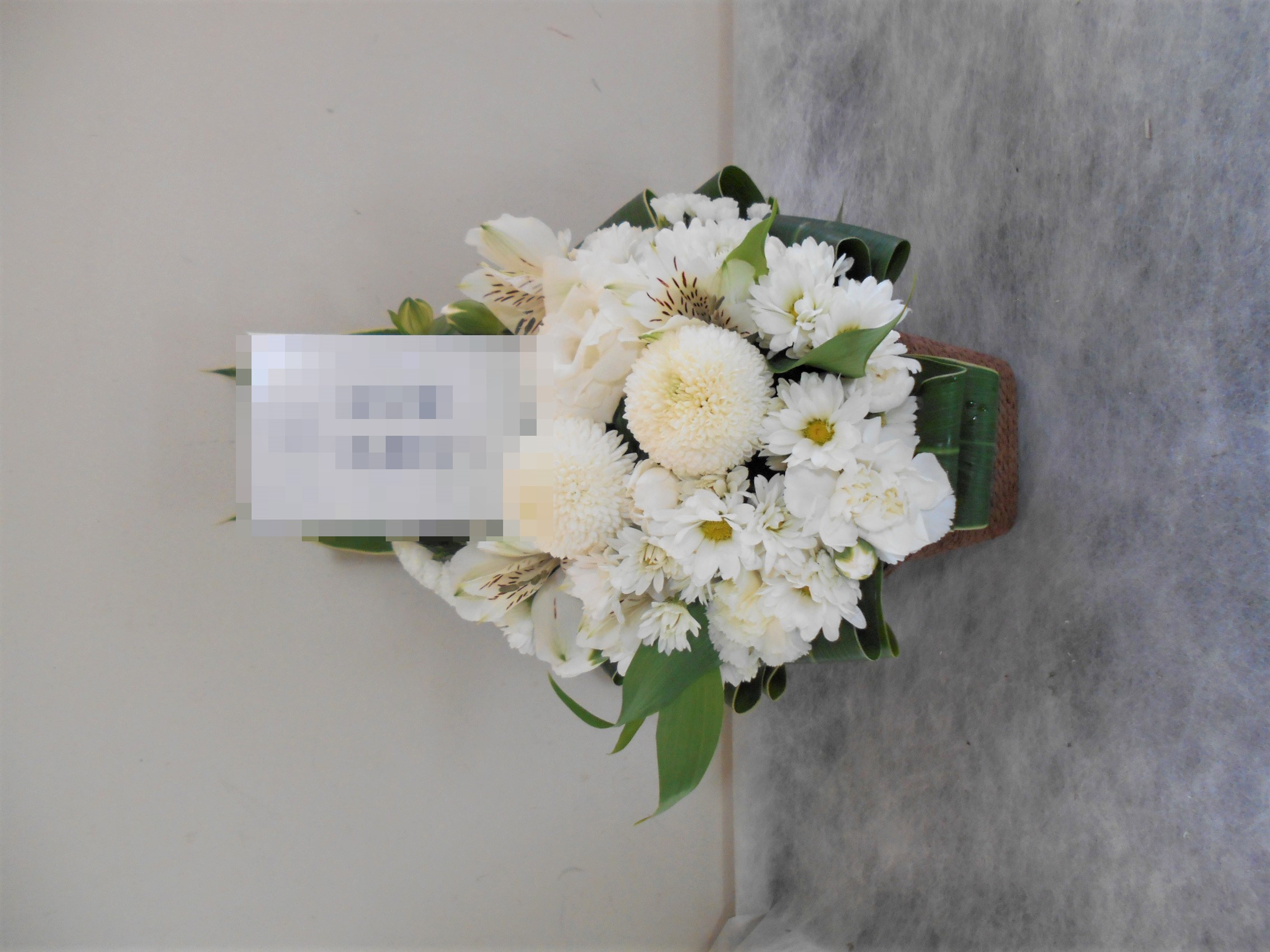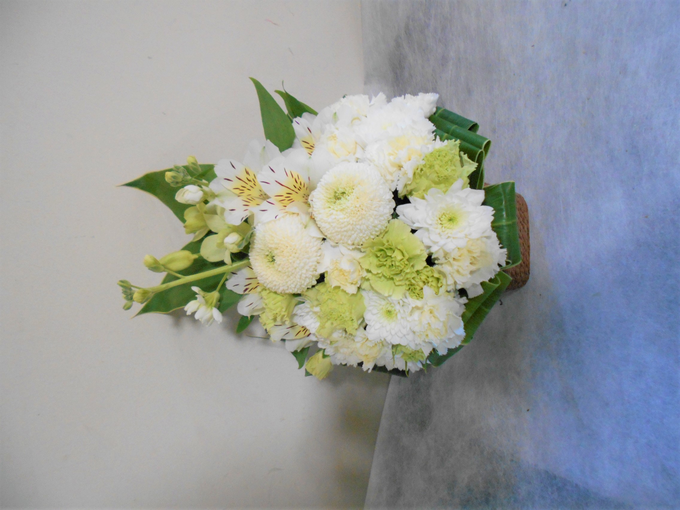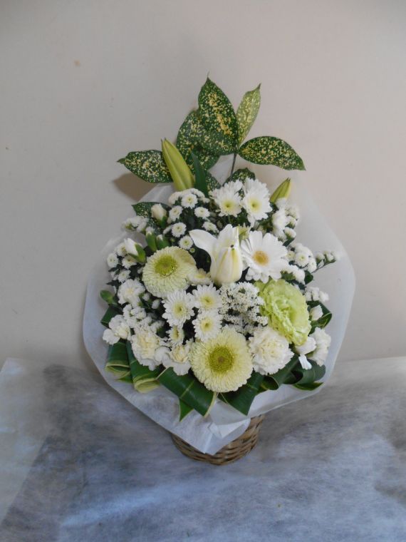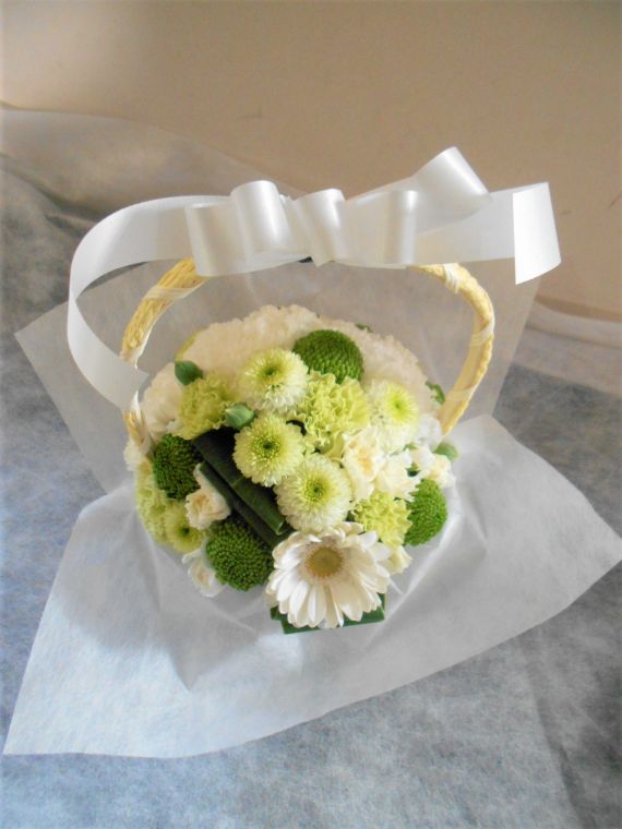お悔やみ お供えの花 供花 (ホワイト&グリーンでまとめたバスケットアレンジ)