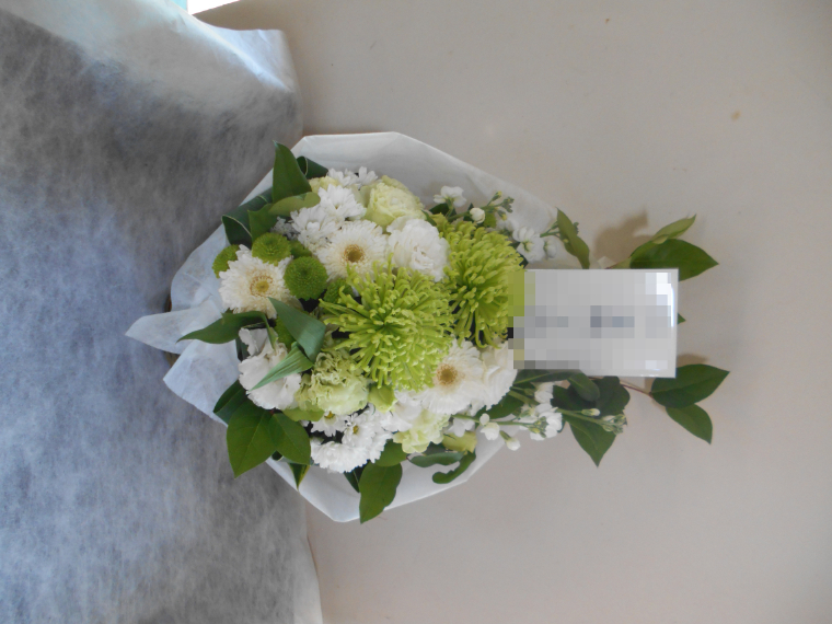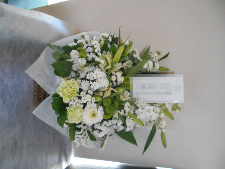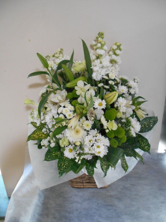 お悔やみ お供えの花 供花 (ホワイト&グリーンを基調にしたバスケットアレンジ)
