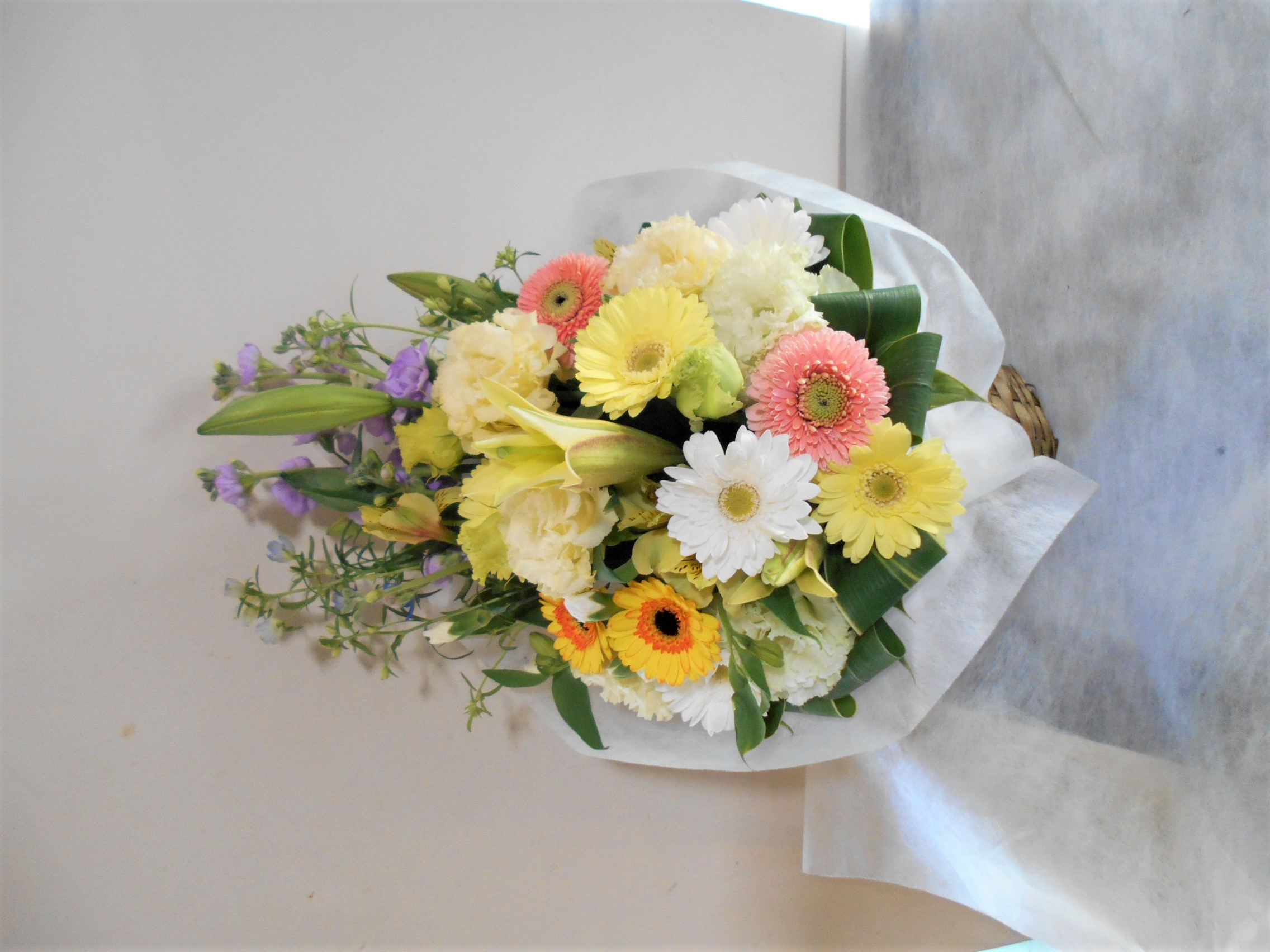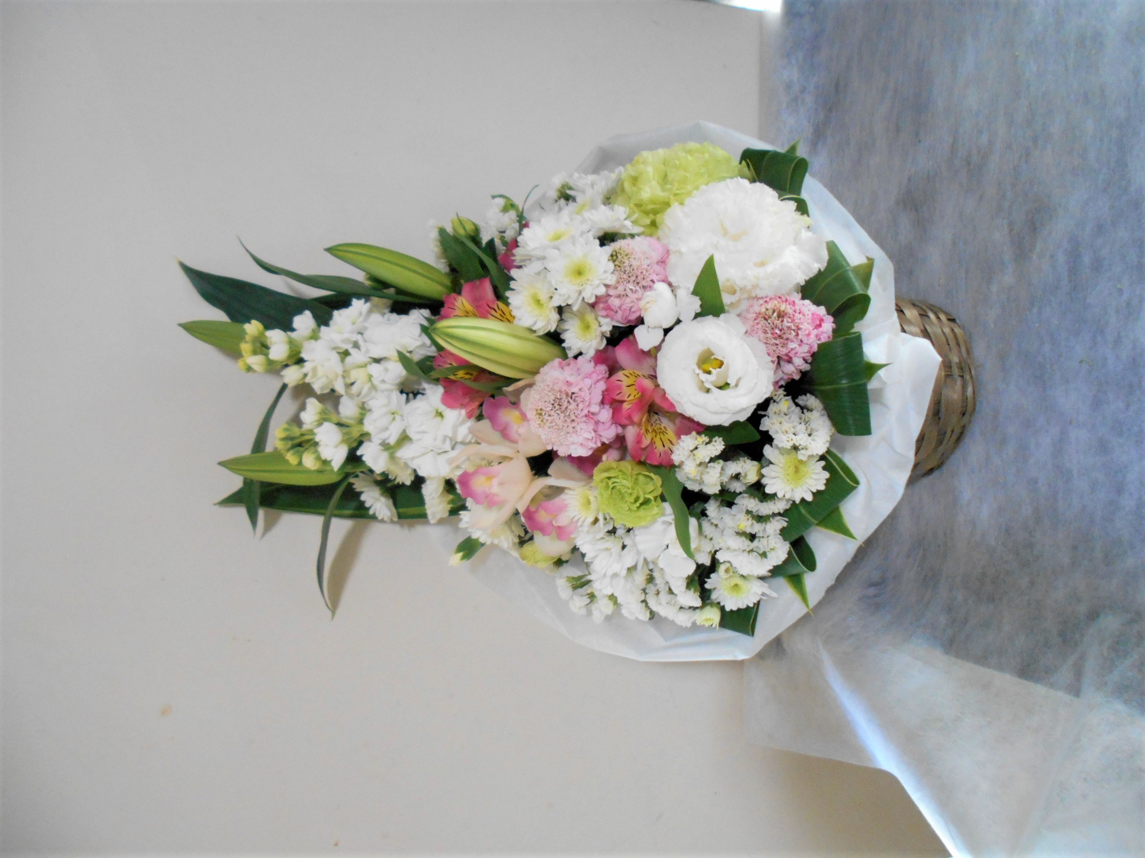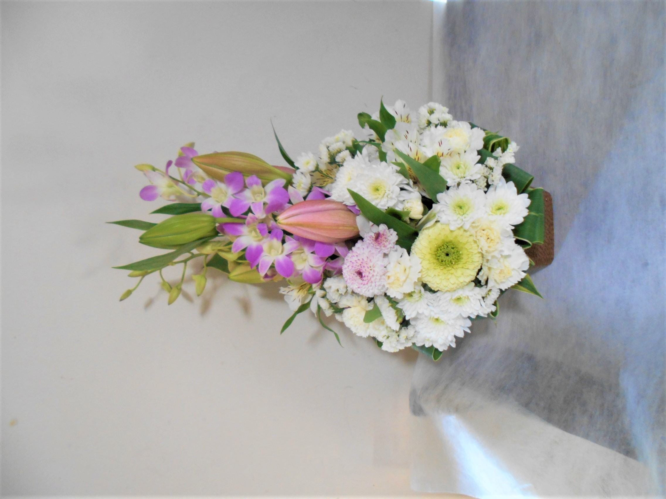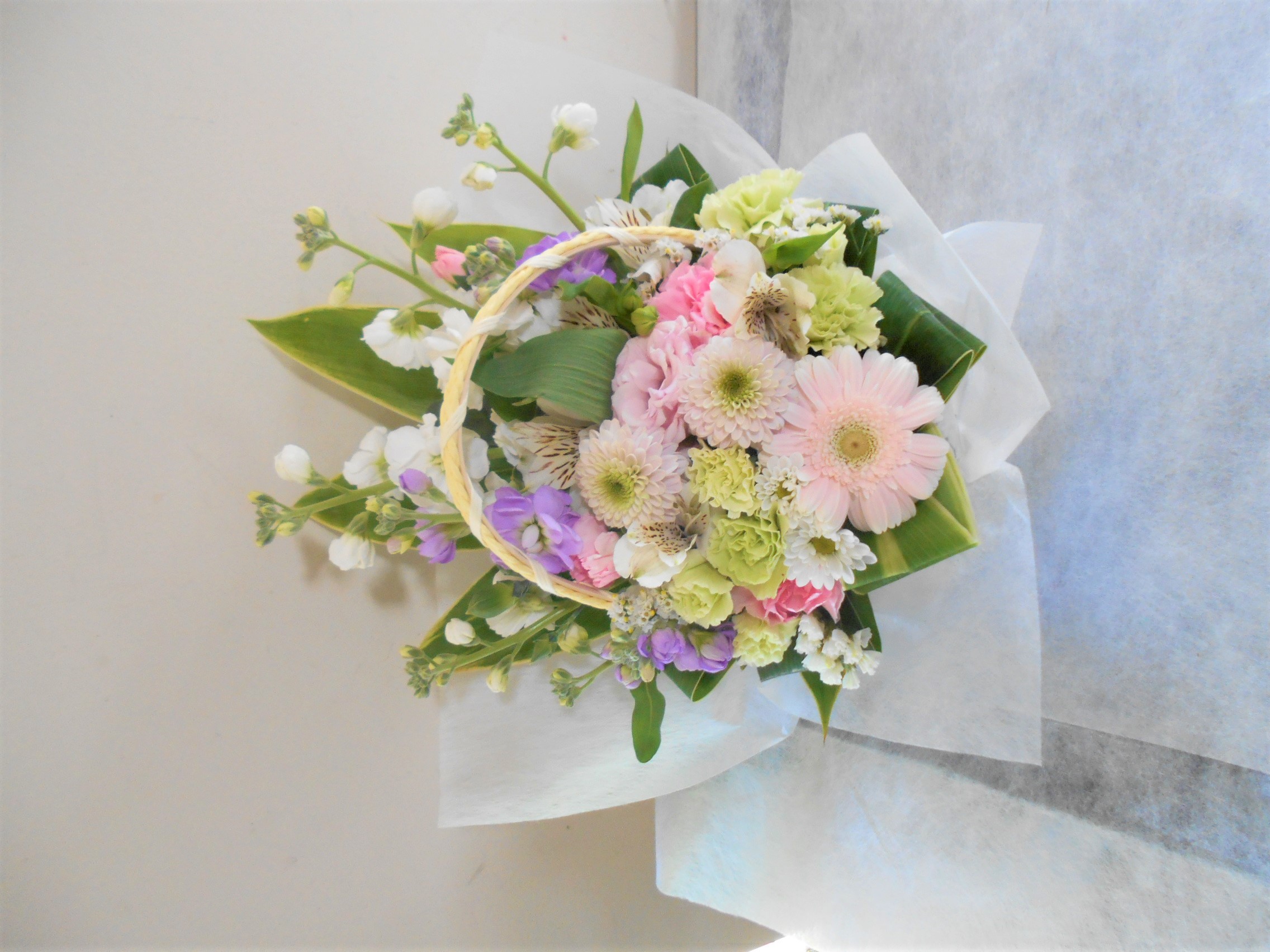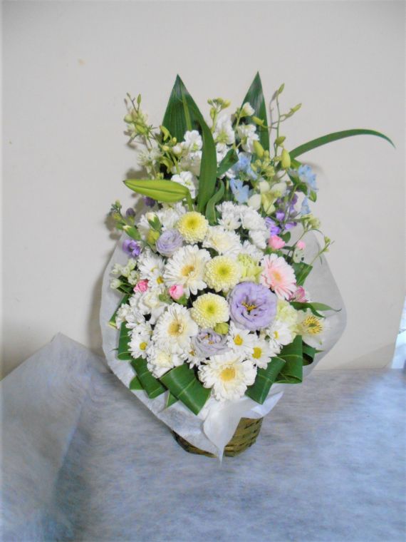 お悔やみ お供えの花 供花 (ホワイト&淡色カラーの手付きバスケットアレンジ)