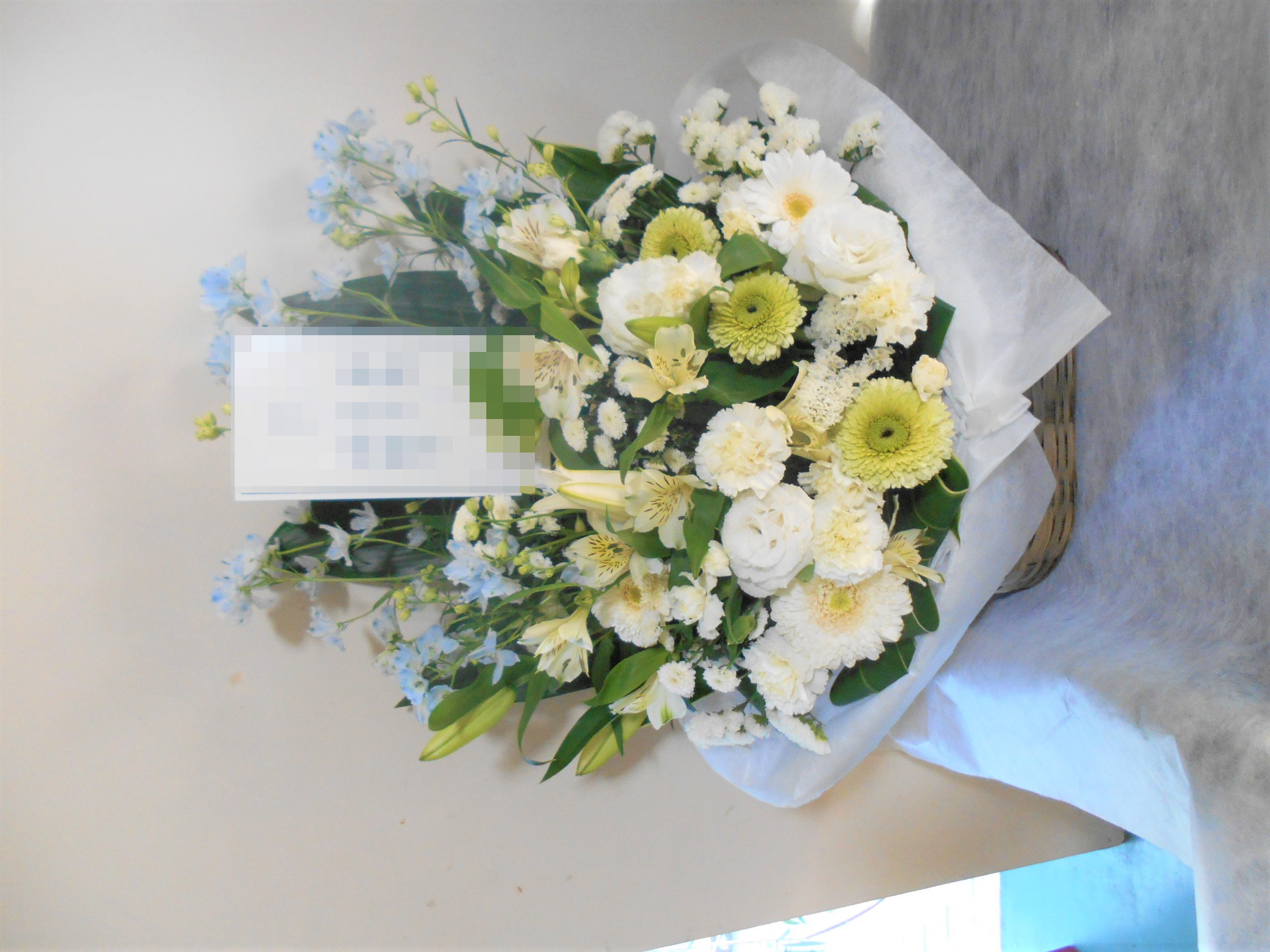 【白系】お悔やみ お供えの花 供花 (ホワイト&青・紫系カラーのお花でまとめたバスケットアレンジ)