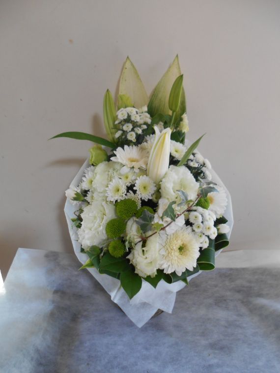 お悔やみ お供えの花 供花 (白ユリをメインにホワイト系にまとめた高さのあるバスケットアレンジ)
