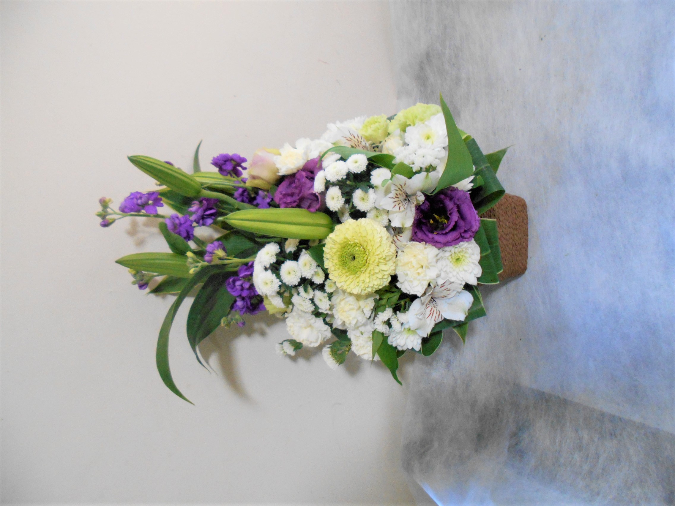 お悔やみ お供えの花 供花 (白基調でユリと紫系のお花をあしらったバスケットアレンジ)