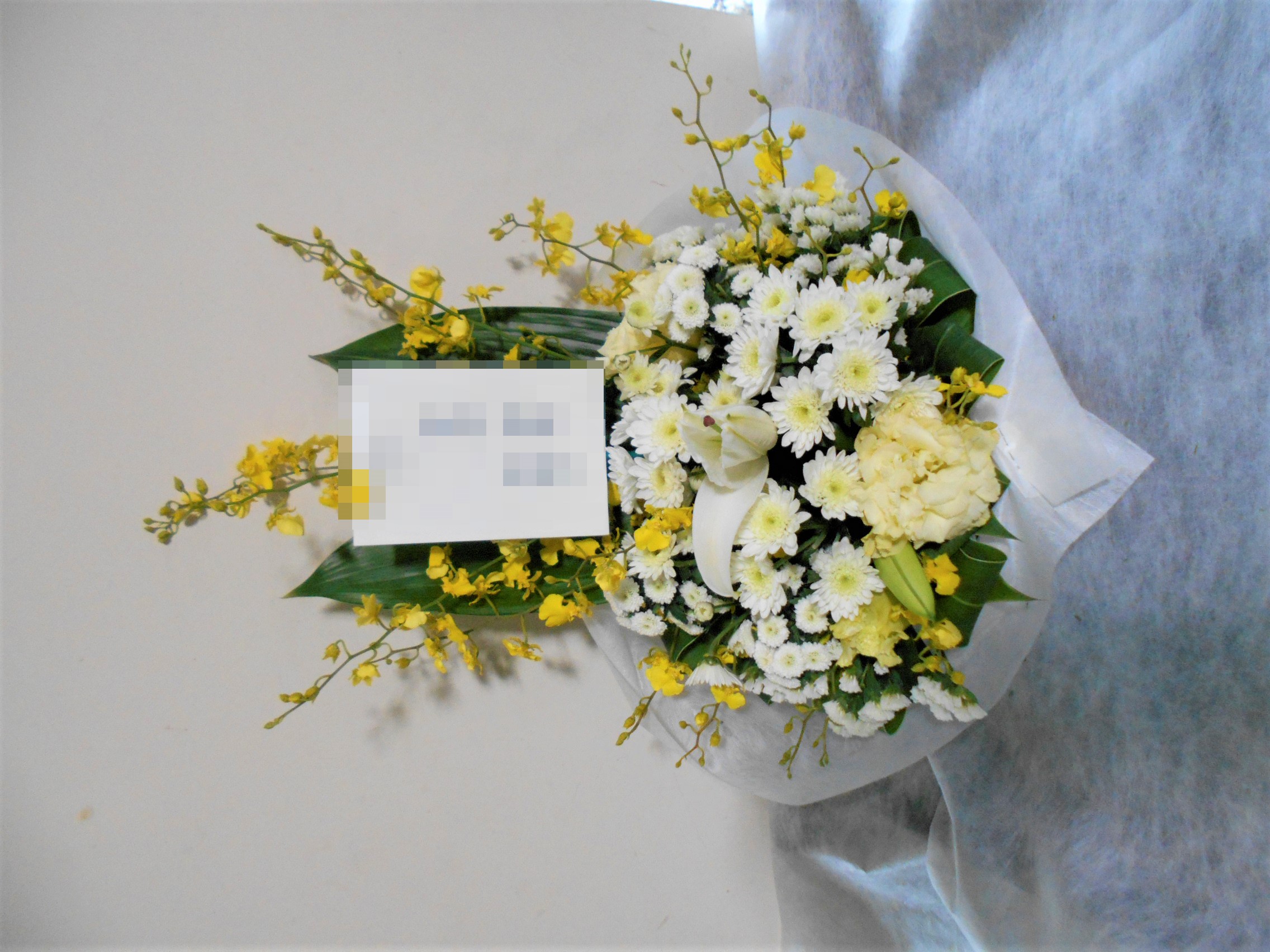 お悔やみ お供えの花 供花 (白ユリをメインに黄色の洋蘭をあしらったバスケットアレンジ)