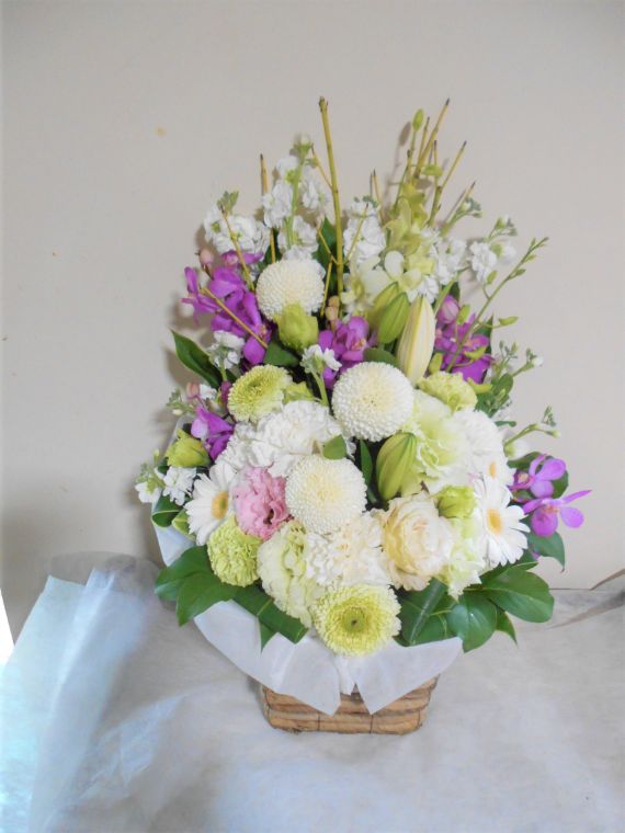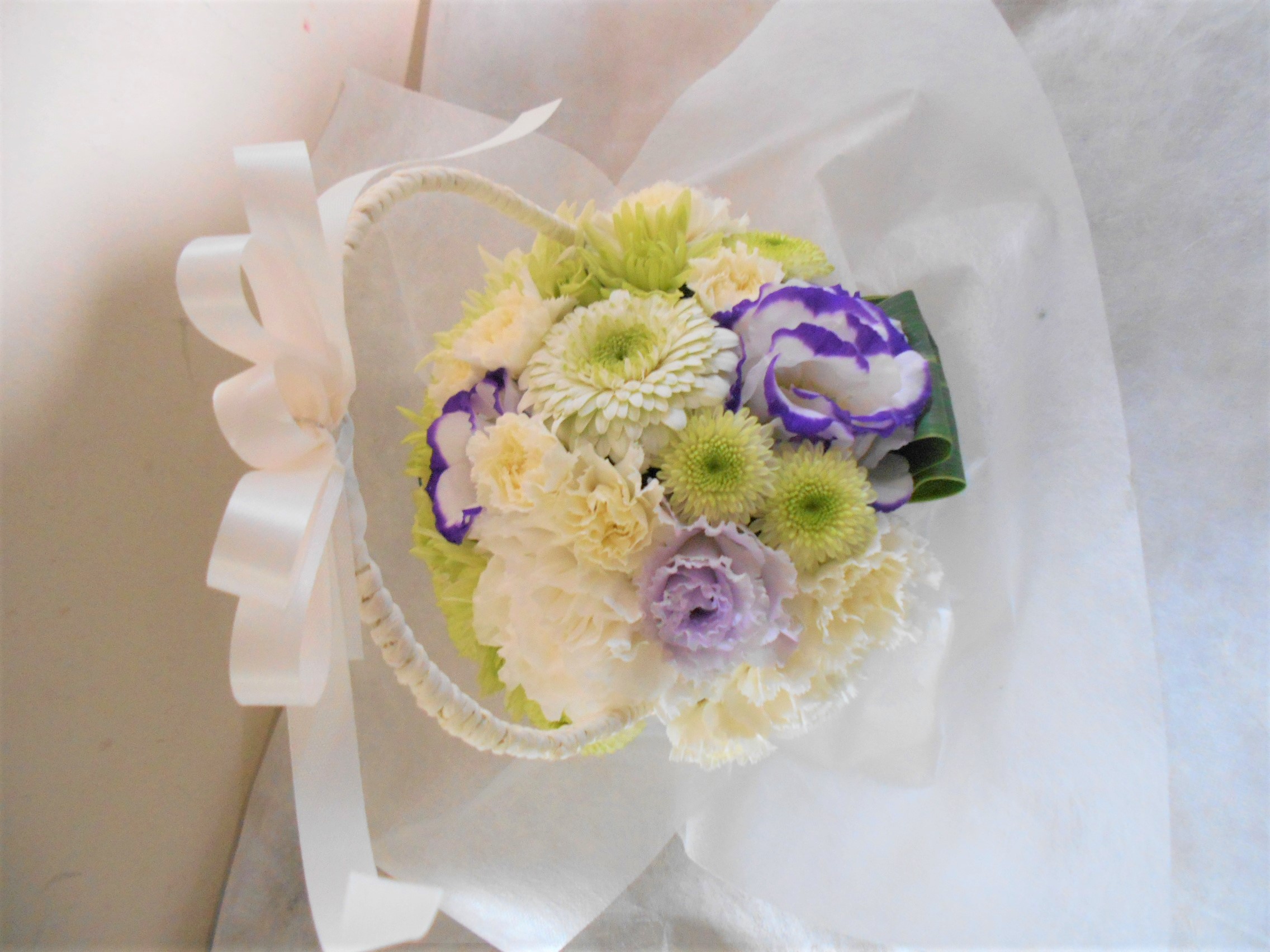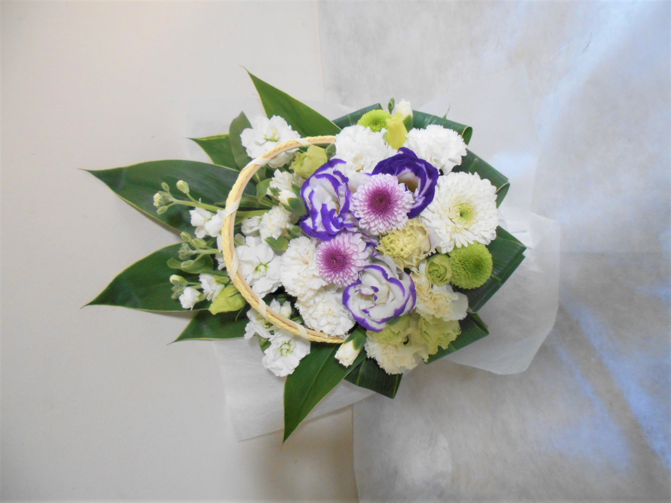 お悔やみ お供えの花 供花 (ホワイト&薄紫系でまとめた手付きのバスケットアレンジ)