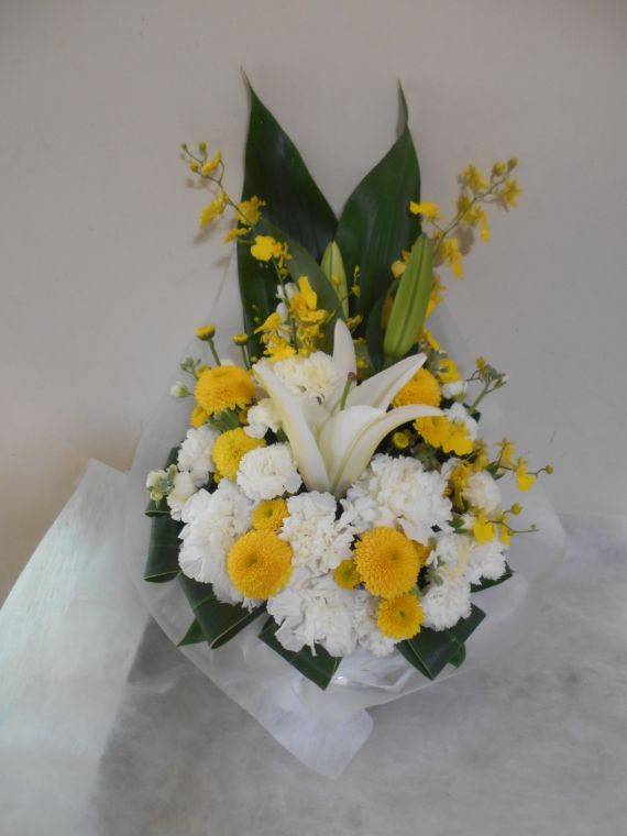 お悔やみ お供えの花 供花 (白ユリをメインに黄色の洋蘭をあしらったバスケットアレンジ)