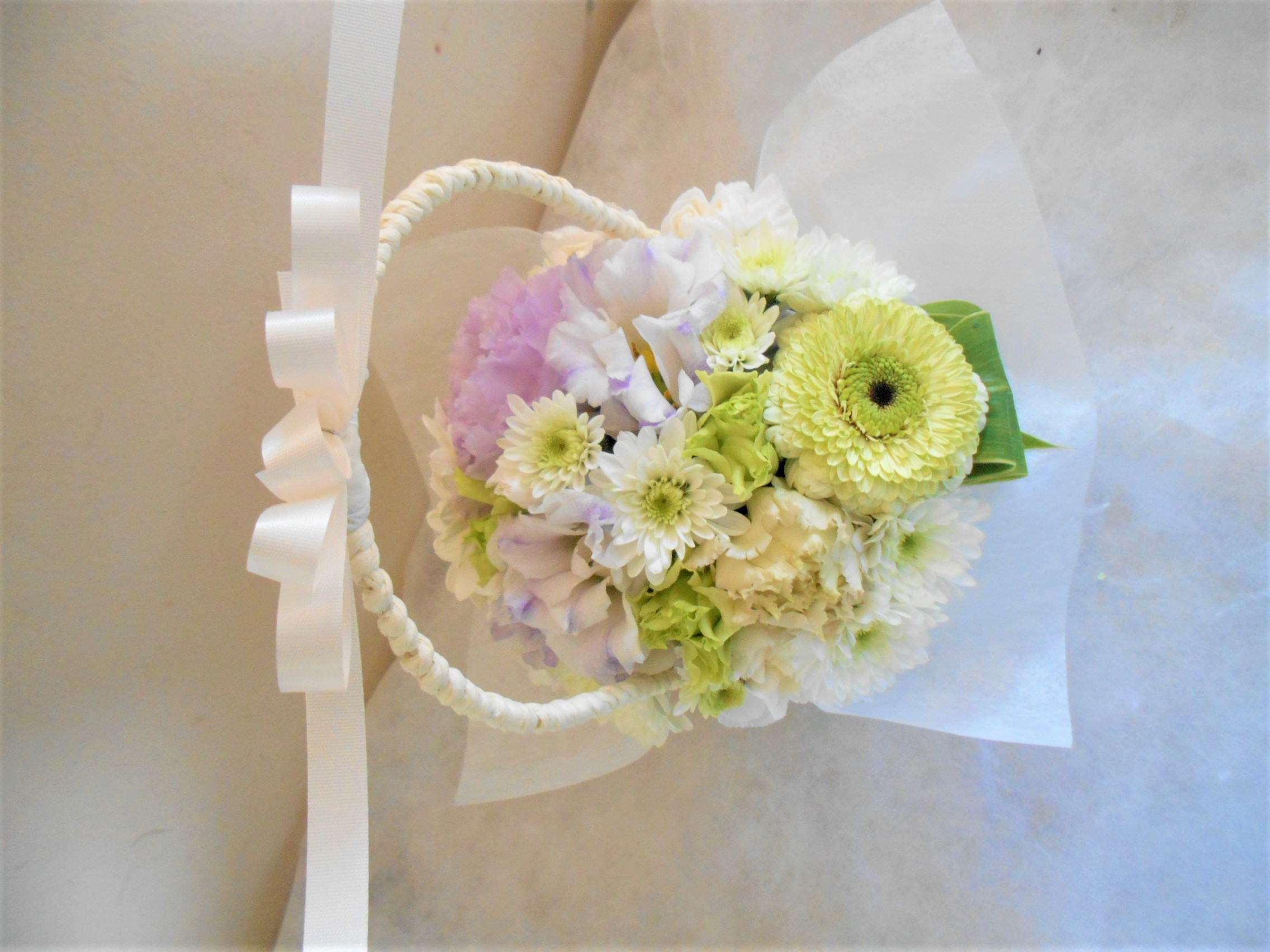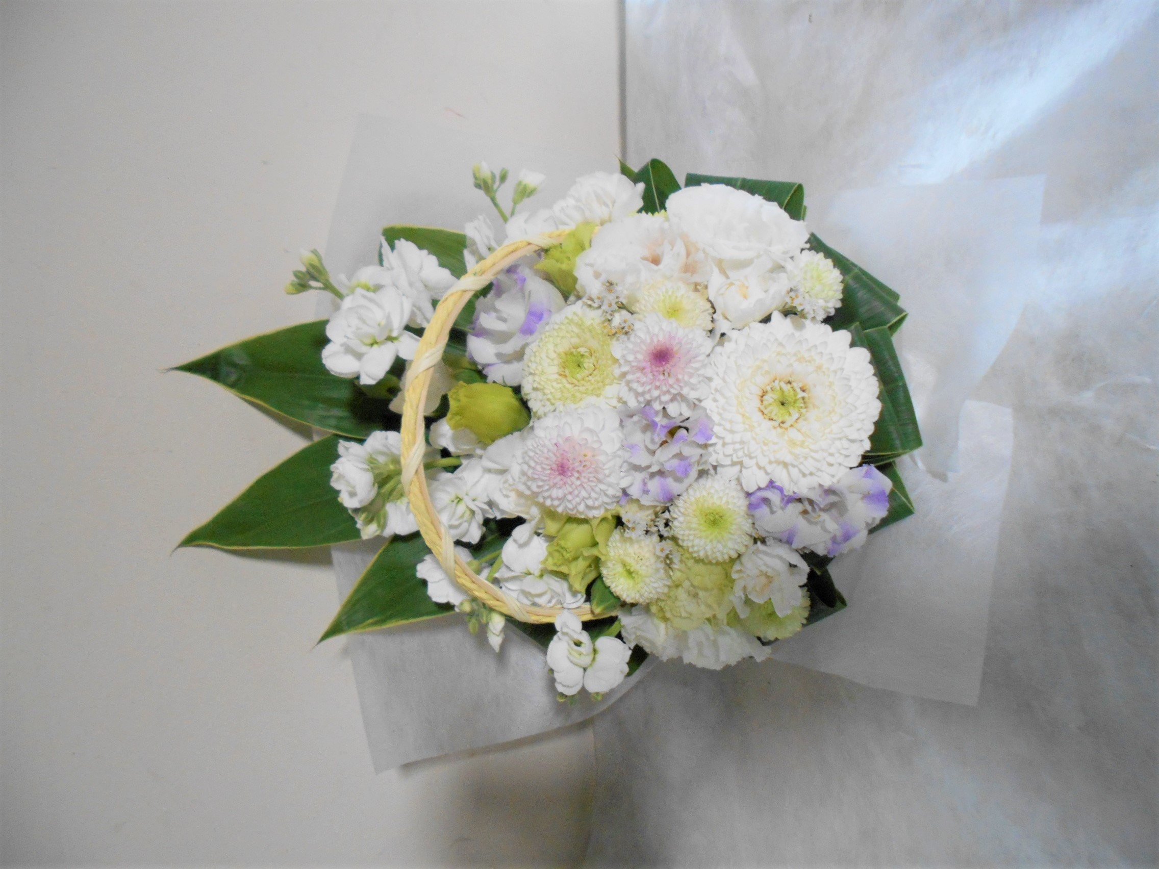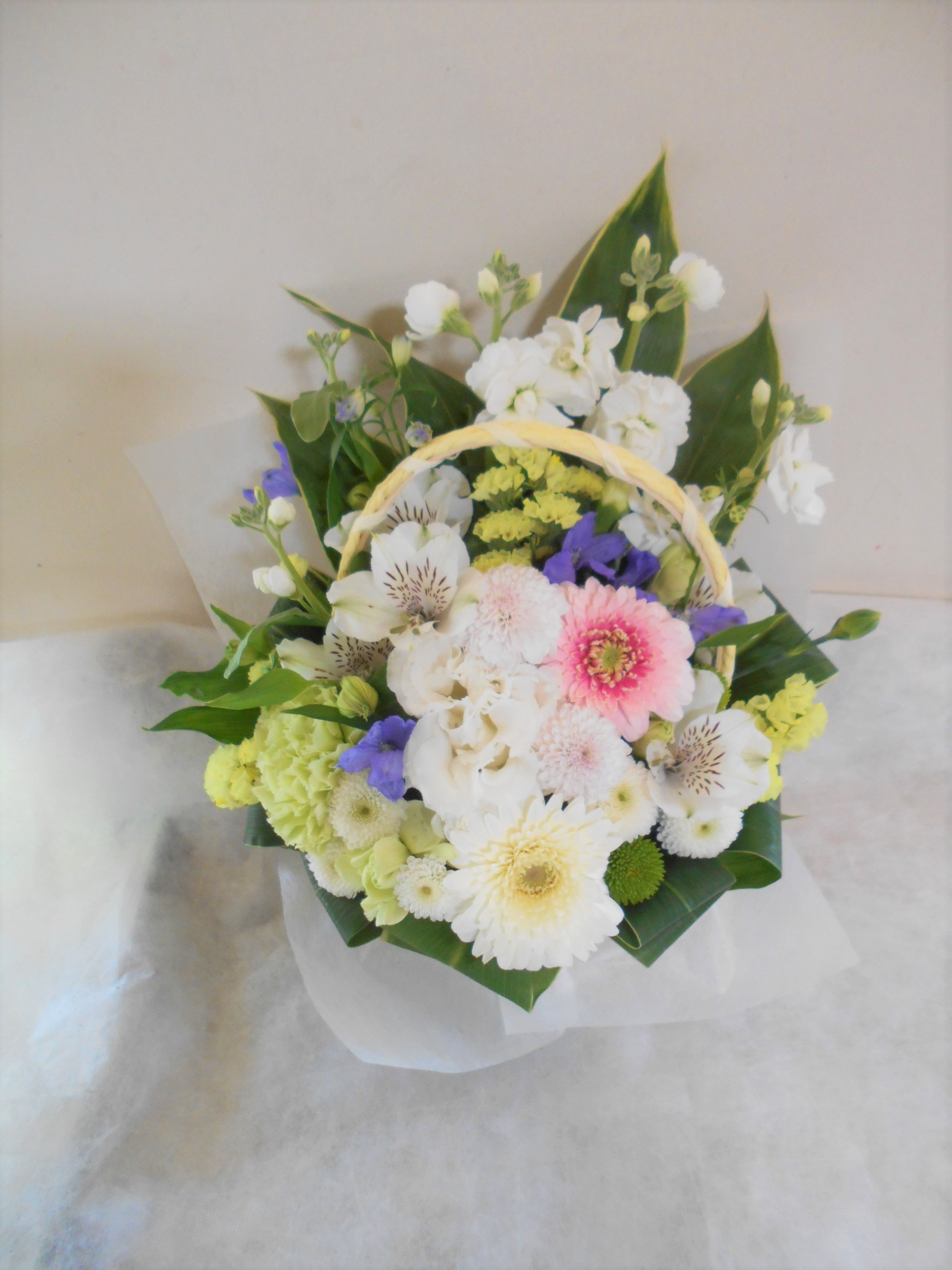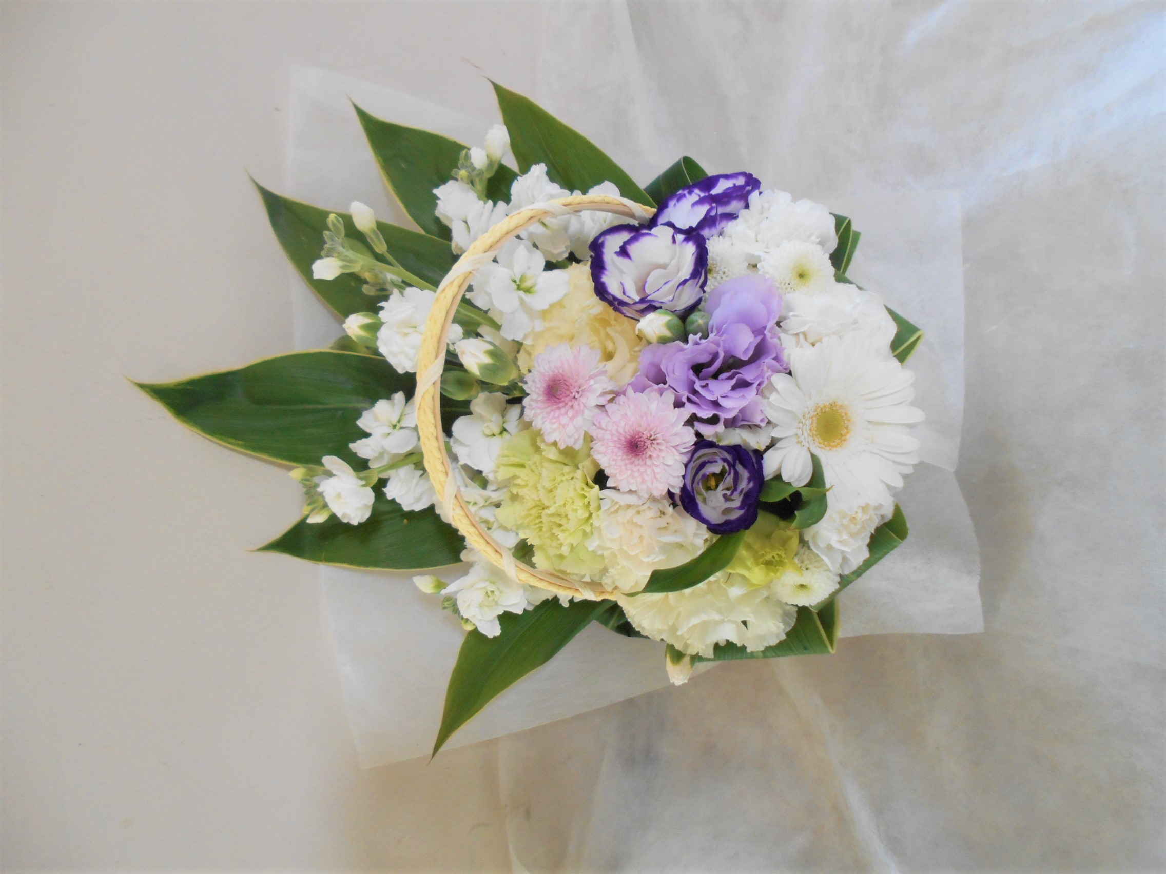 お悔やみ お供えの花 供花 (ホワイト&淡色カラーの手付きバスケットアレンジ)