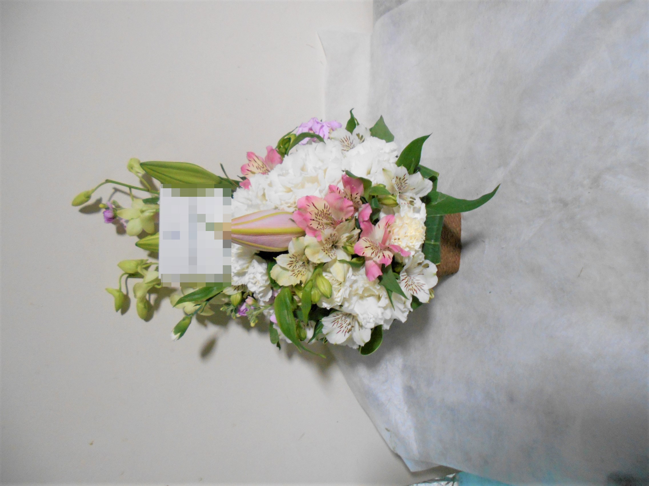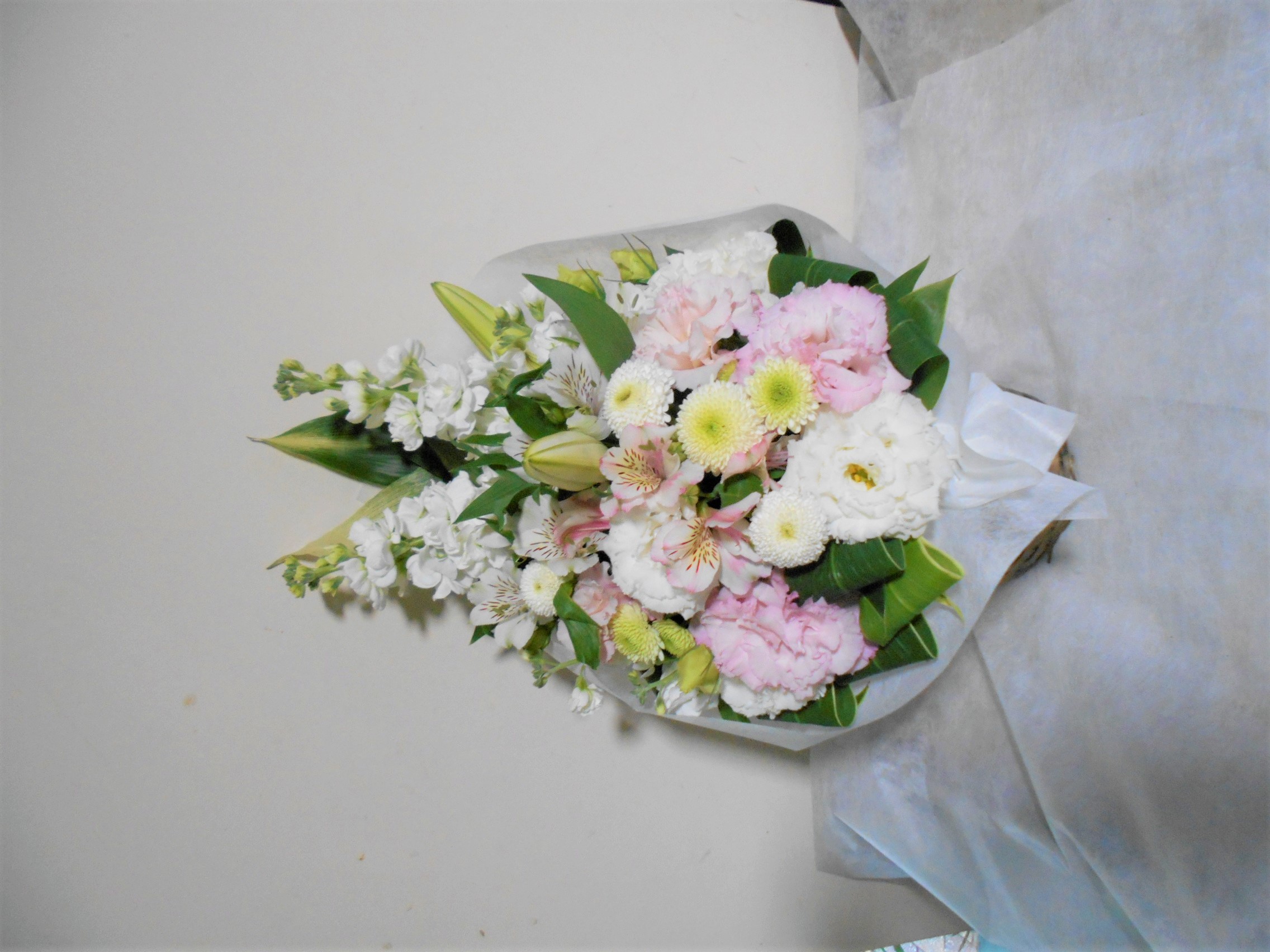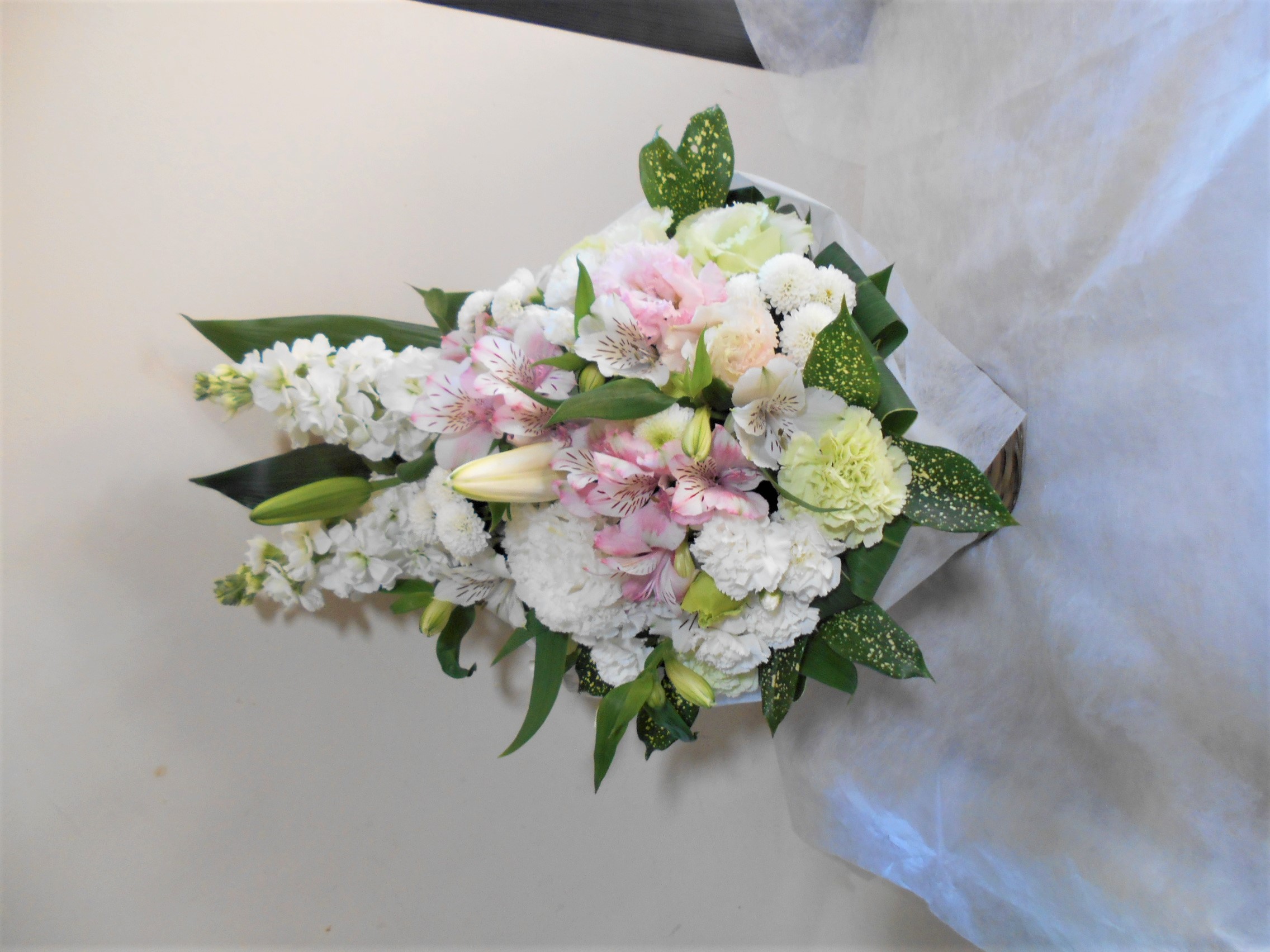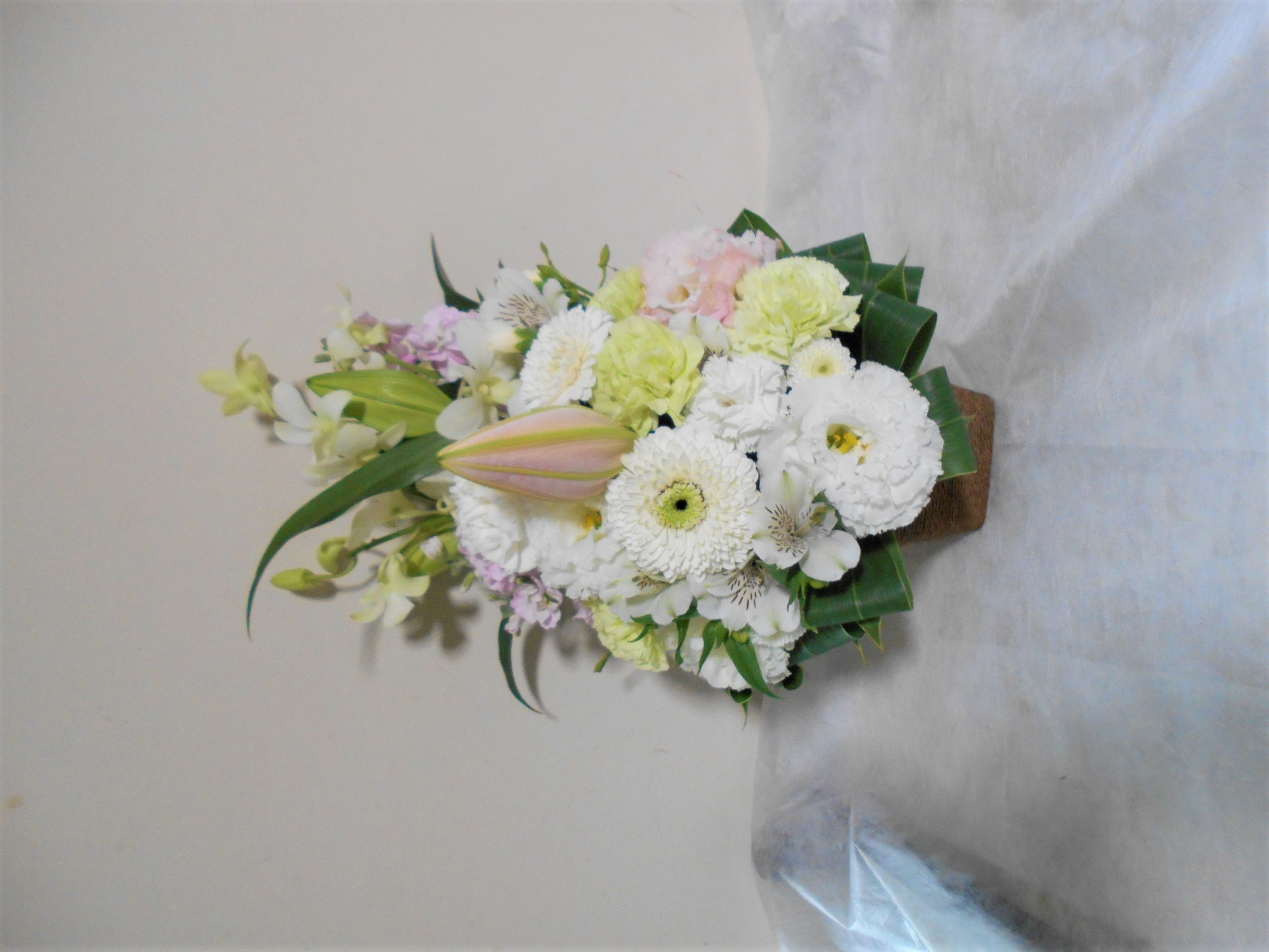お悔やみ お供えの花 供花 (ホワイト&淡色カラーの手付きバスケットアレンジ)
