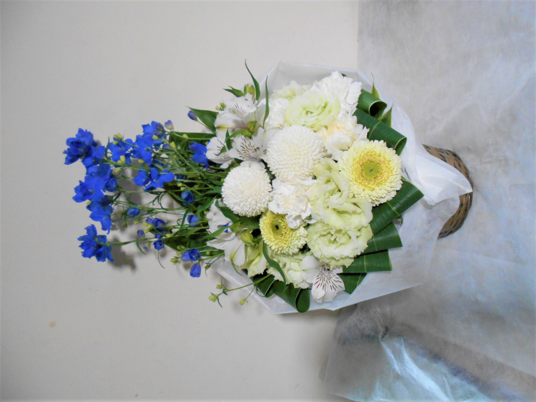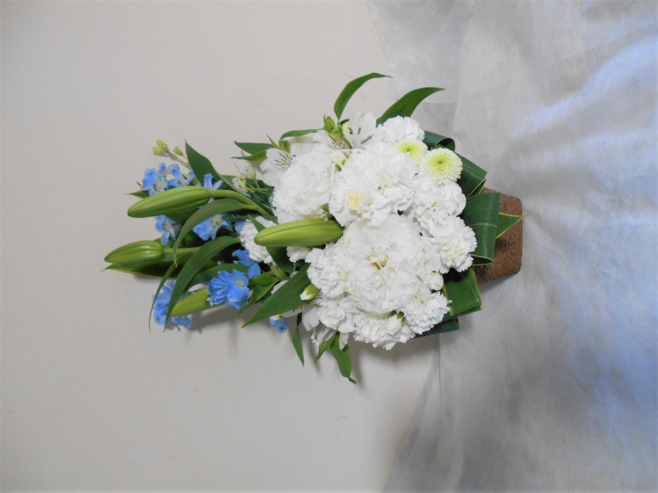 お悔やみ お供えの花 供花 (白基調に青系挿し色をそえたバスケットアレンジ)