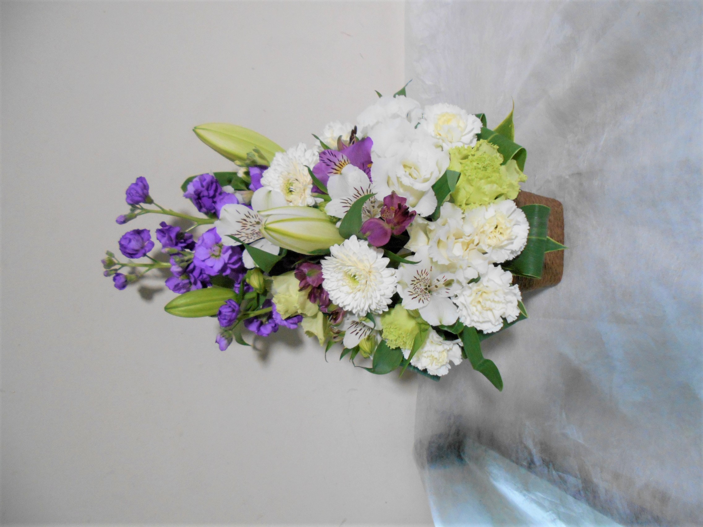 お悔やみ お供えの花 供花 (白基調でユリと紫系のお花をあしらったバスケットアレンジ)
