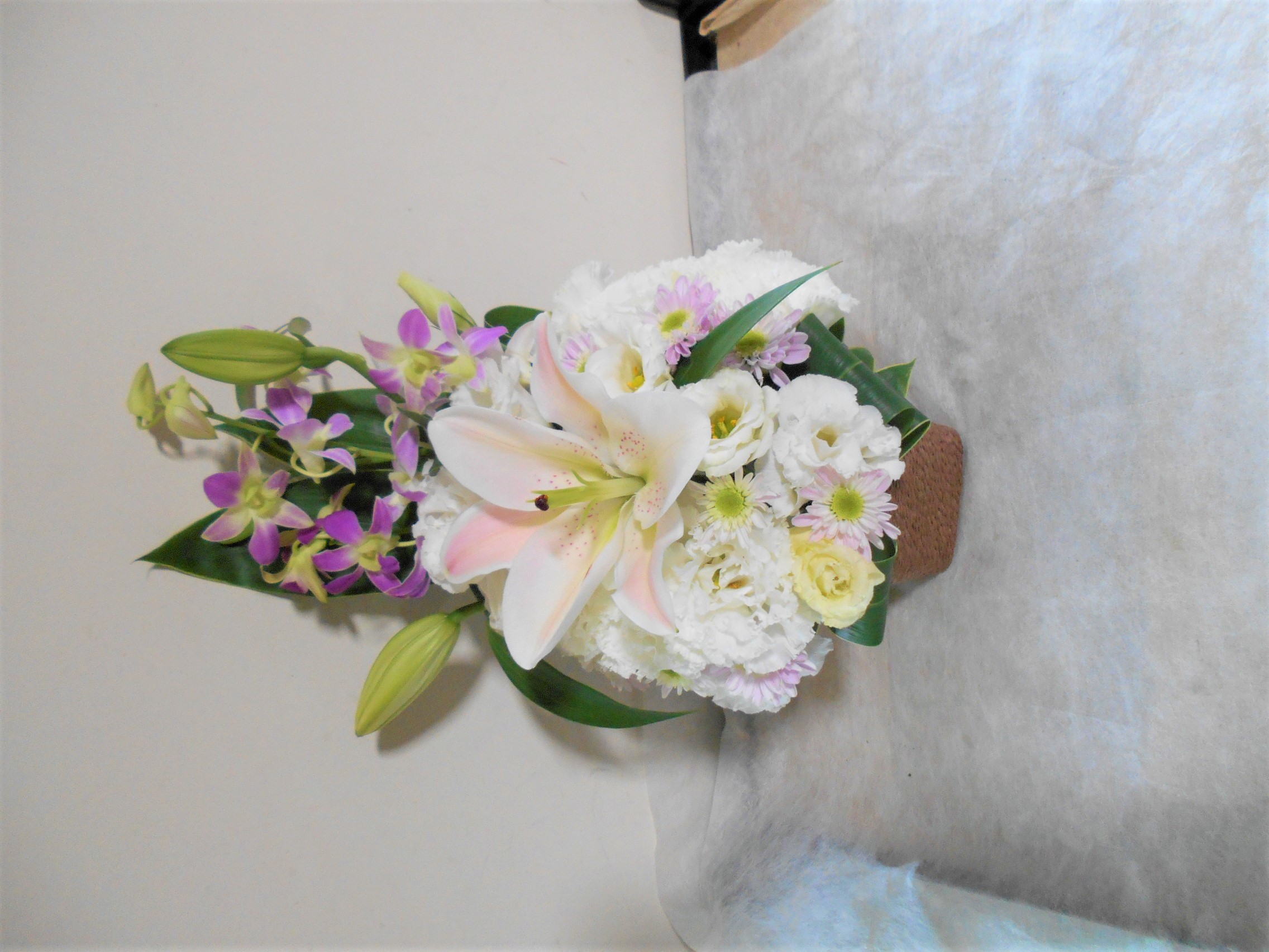 お悔やみ お供えの花 供花 (白ユリをメインにホワイト&ピンクでまとめたバスケットアレンジ)